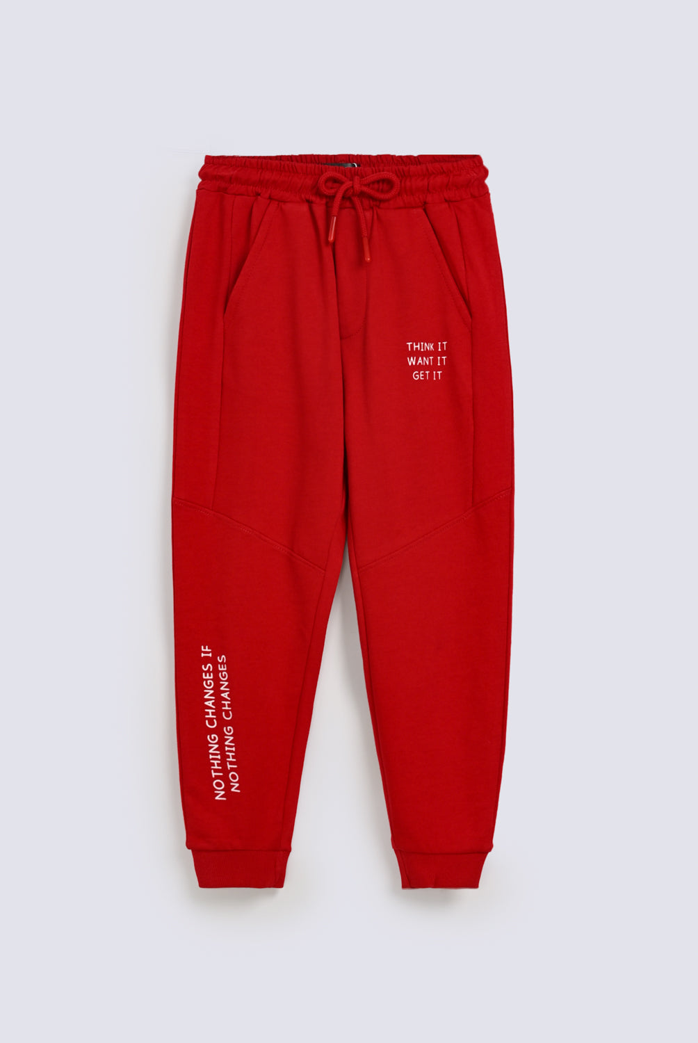 Bright red jogger trouser with playful cut and sew panels, a comfy drawstring waist, and white text printed on the front for a cool touch.