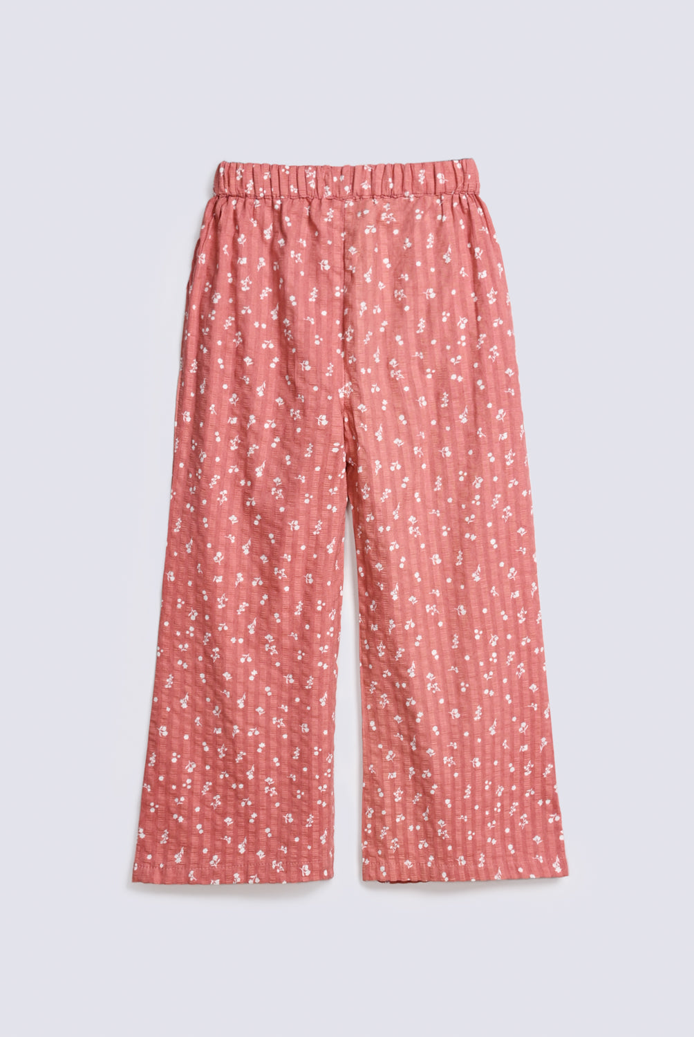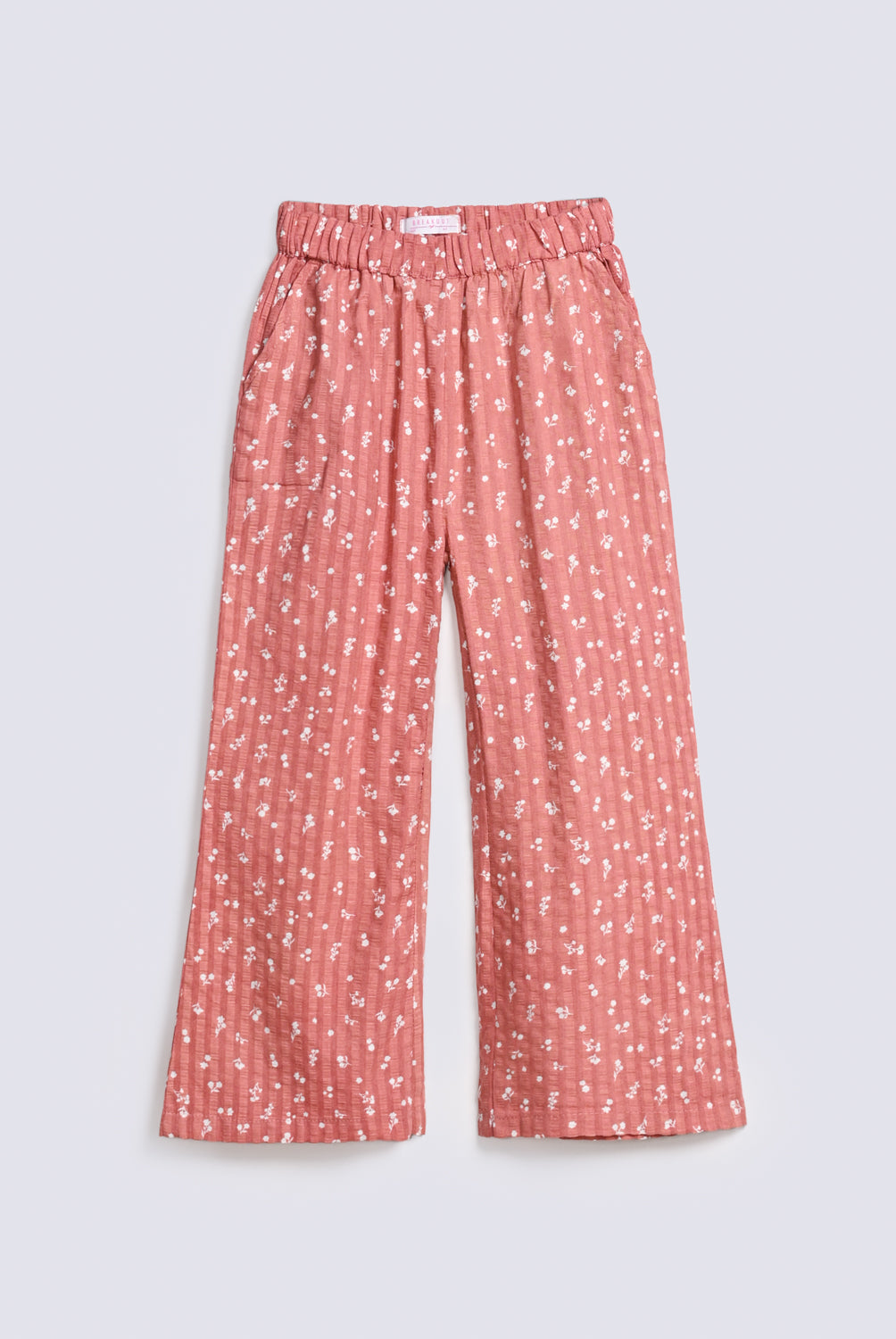 Peach pink loose trouser covered in white florals with an elastic waist that keeps it comfortable.