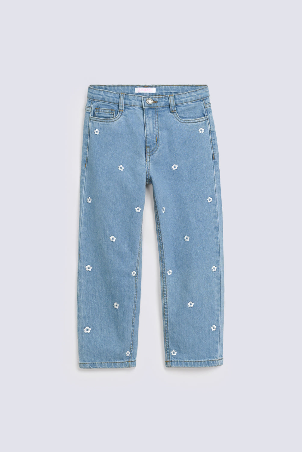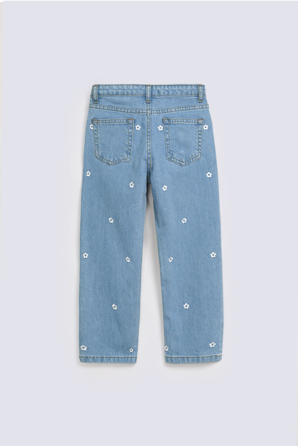 Light blue mom fit denim decorated with embroidered white flowers, designed to stay comfortable while adding a fun touch to everyday wear.