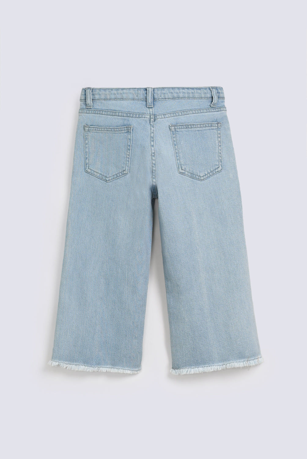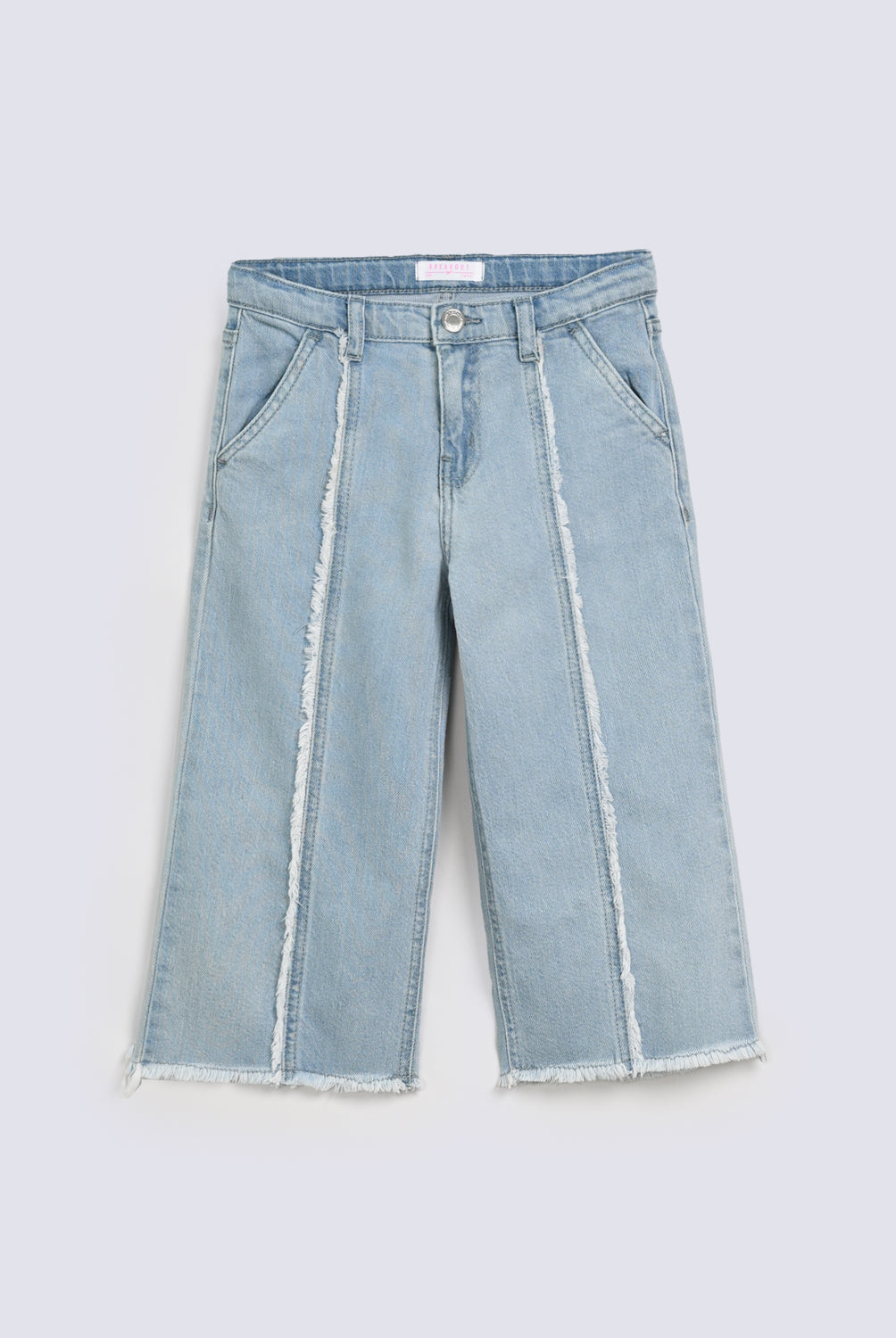 Light blue wide leg capri with frayed hems and detailing that gives a relaxed look.