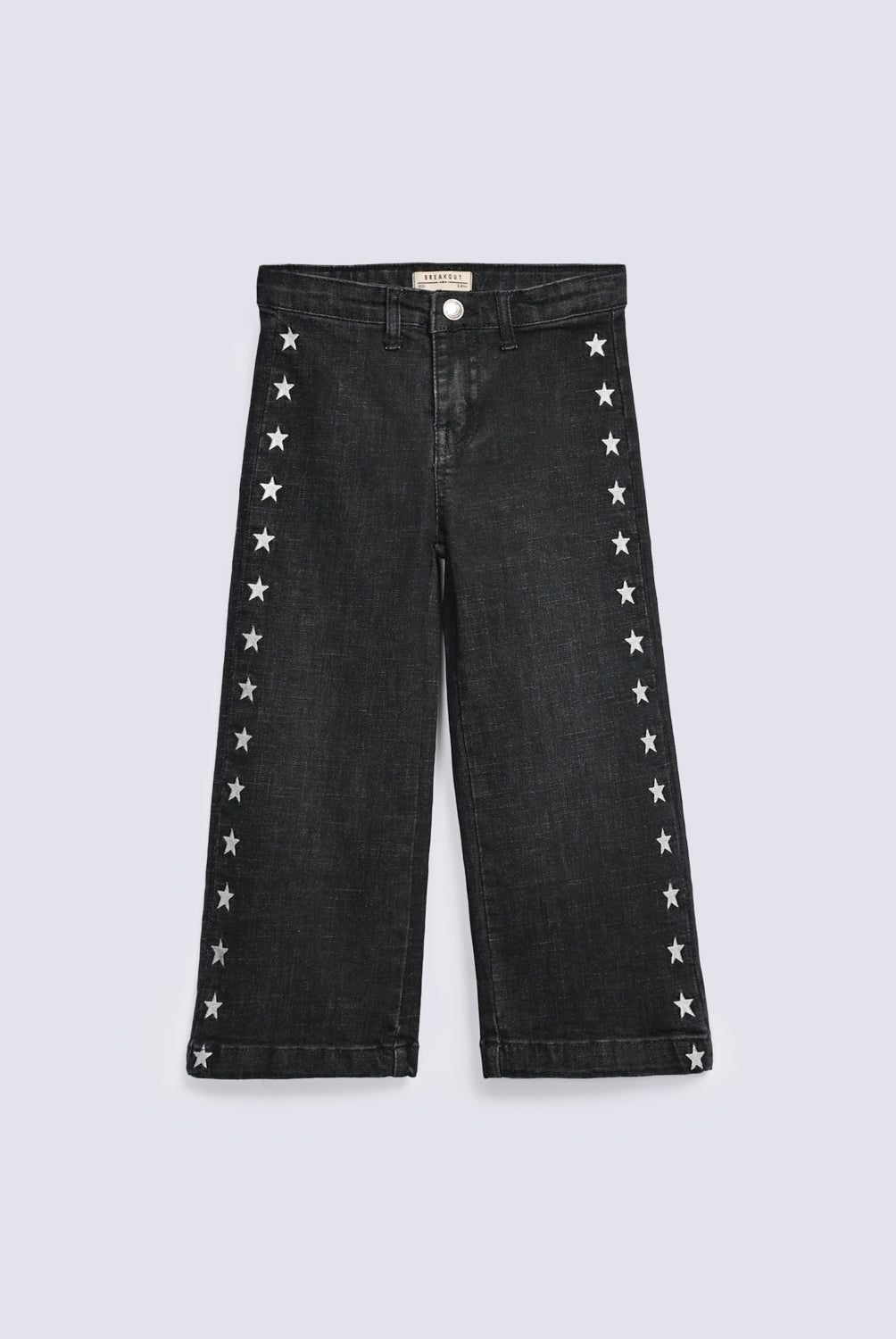 Black flare denim with embroidered stars running down the sides from top to hem, giving every step a bit of sparkle!