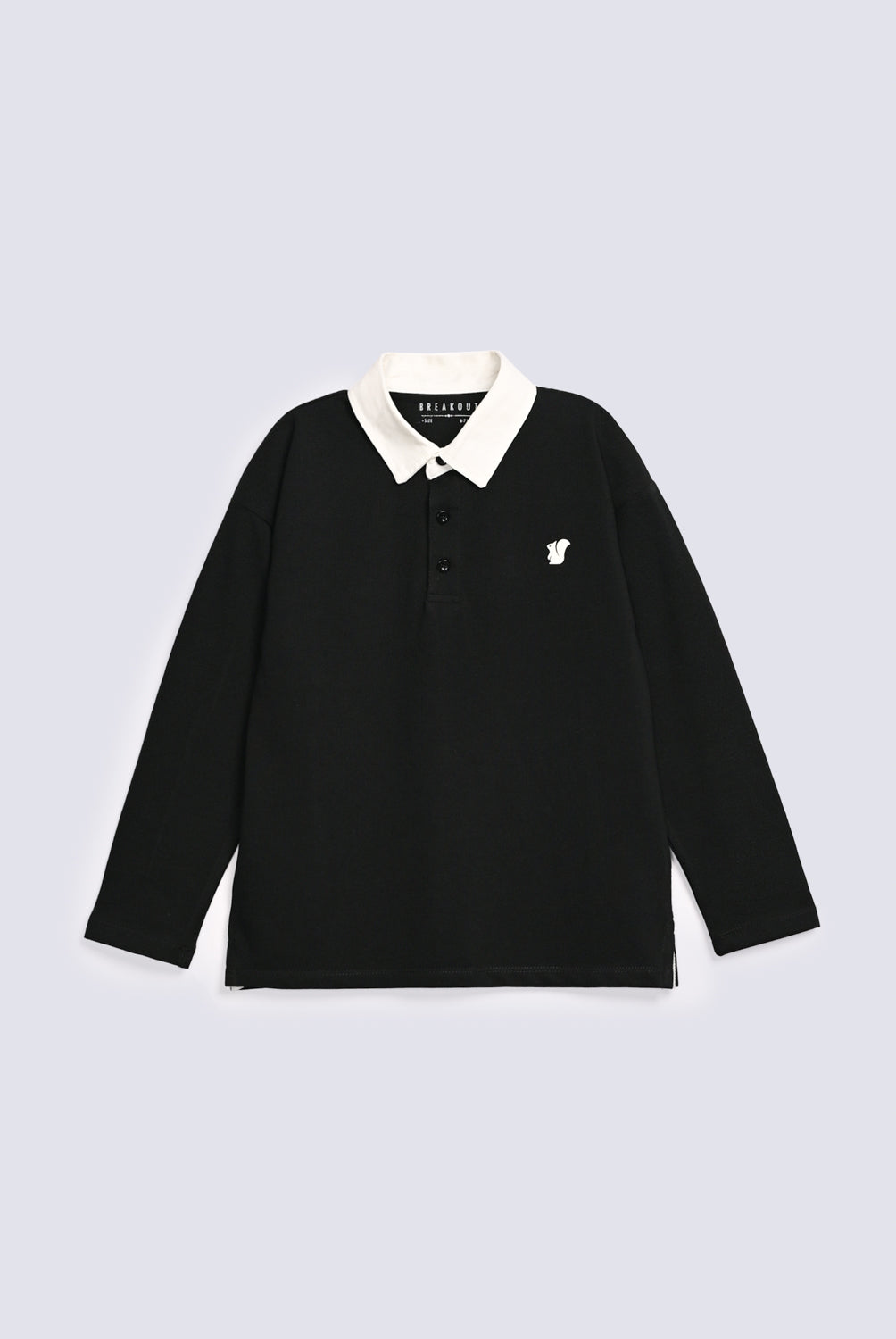 All black polo with a white collar, full sleeves, and a little squirrel on the chest.