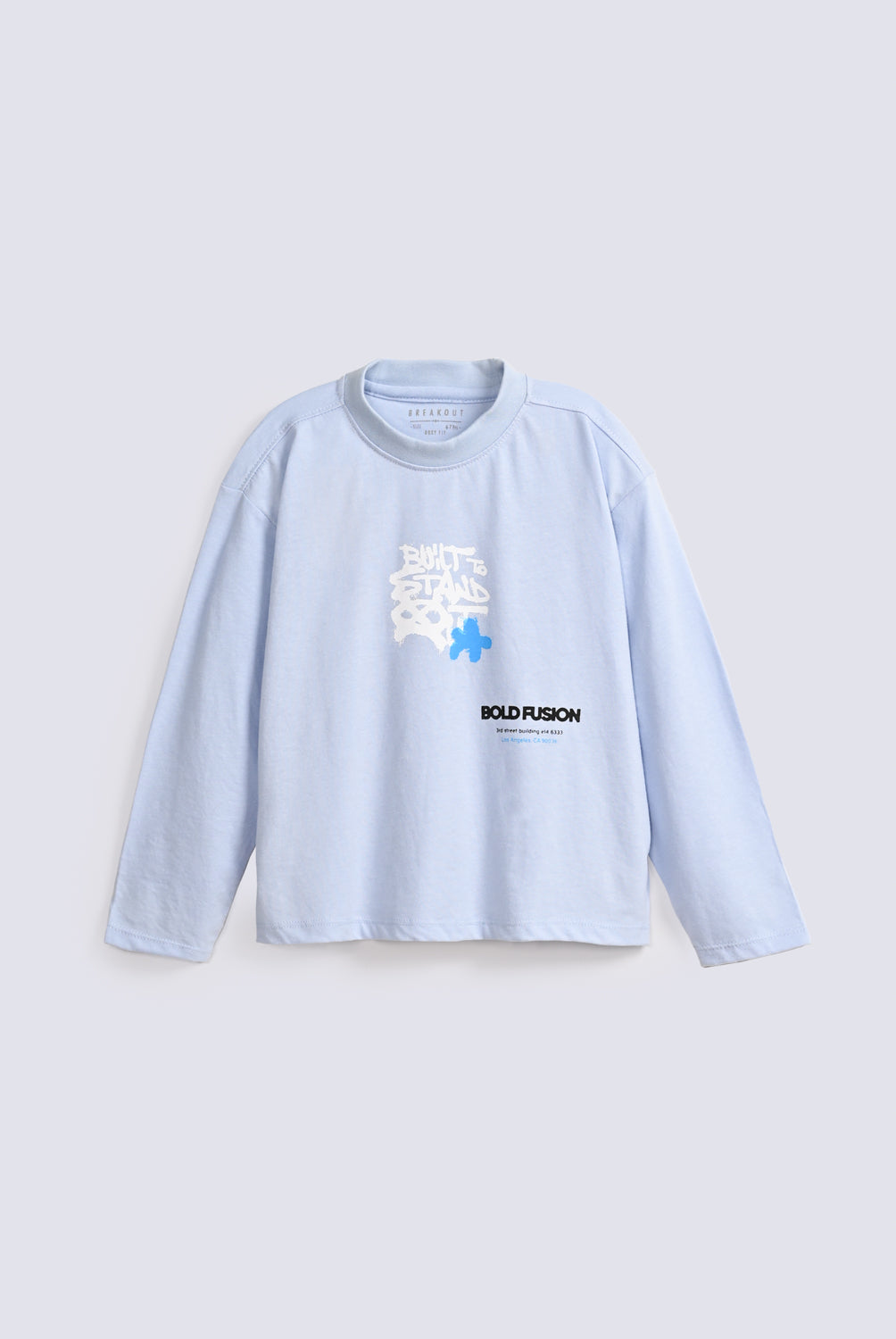 Soft baby blue tee with bold black and white text on the front and an even bigger version on the back for extra impact.