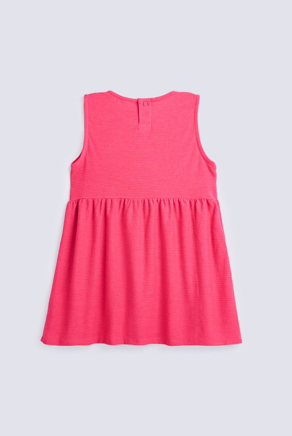 Pink textured dress with a sweet bow on the front and a single button fastening at the back.