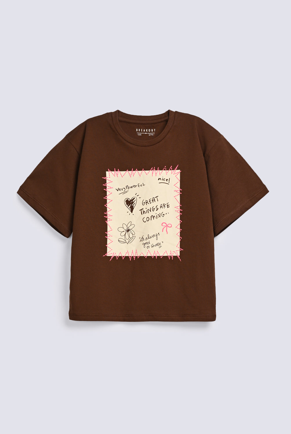 Brown tee with a bold beige and pink print, filled with cheerful affirmations and playful doodles.
