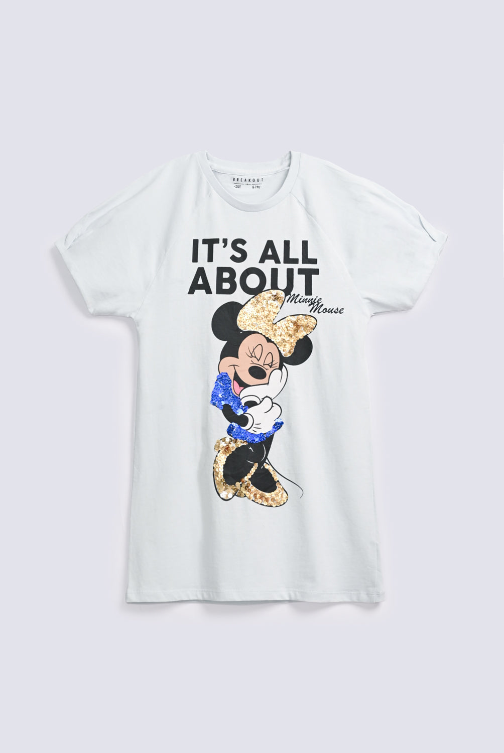 Ice blue long dress with raglan sleeves and a big Minnie Mouse print on the front.
