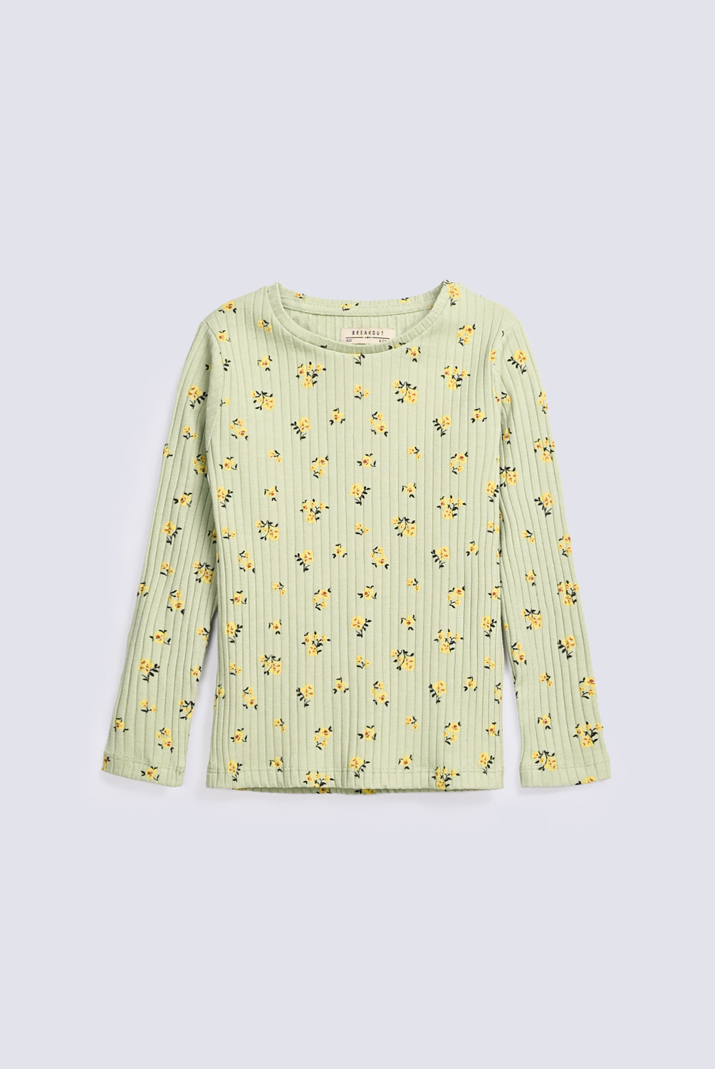 Pistachio colored ribbed tee with full sleeves and a lively yellow floral print.
