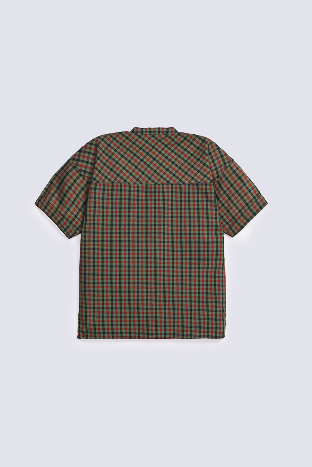 Short sleeved checkered shirt in dark colors with a chest pocket, matching buttons, and a mandarin collar.