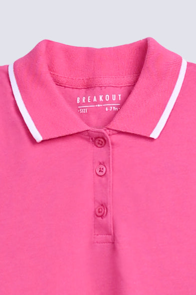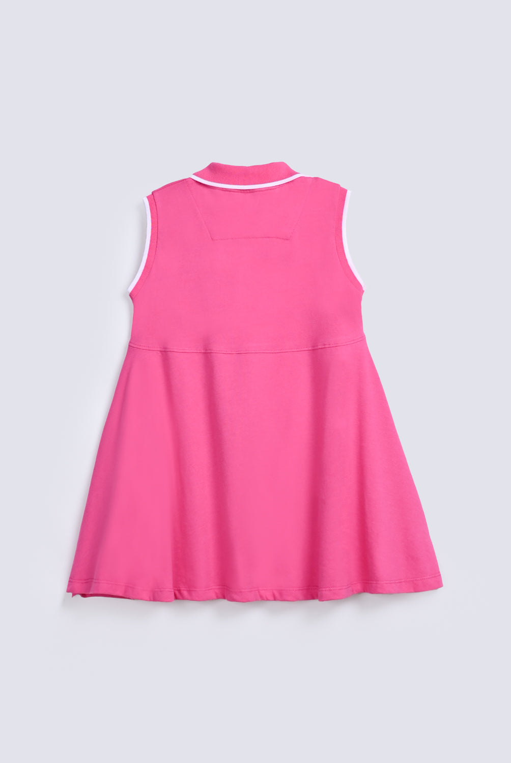 A sleeveless pink polo dress with crisp white trims and three matching buttons for a sporty yet sweet finish.