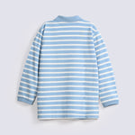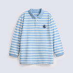 Laidback ocean vibes with soft blue and white stripes, full sleeves for that easy layered look, and a tiny wave print on the left of the chest.