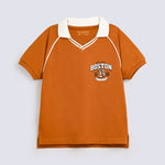 Mustard raglan polo with a soft V neck collar and a fun varsity print on the chest.