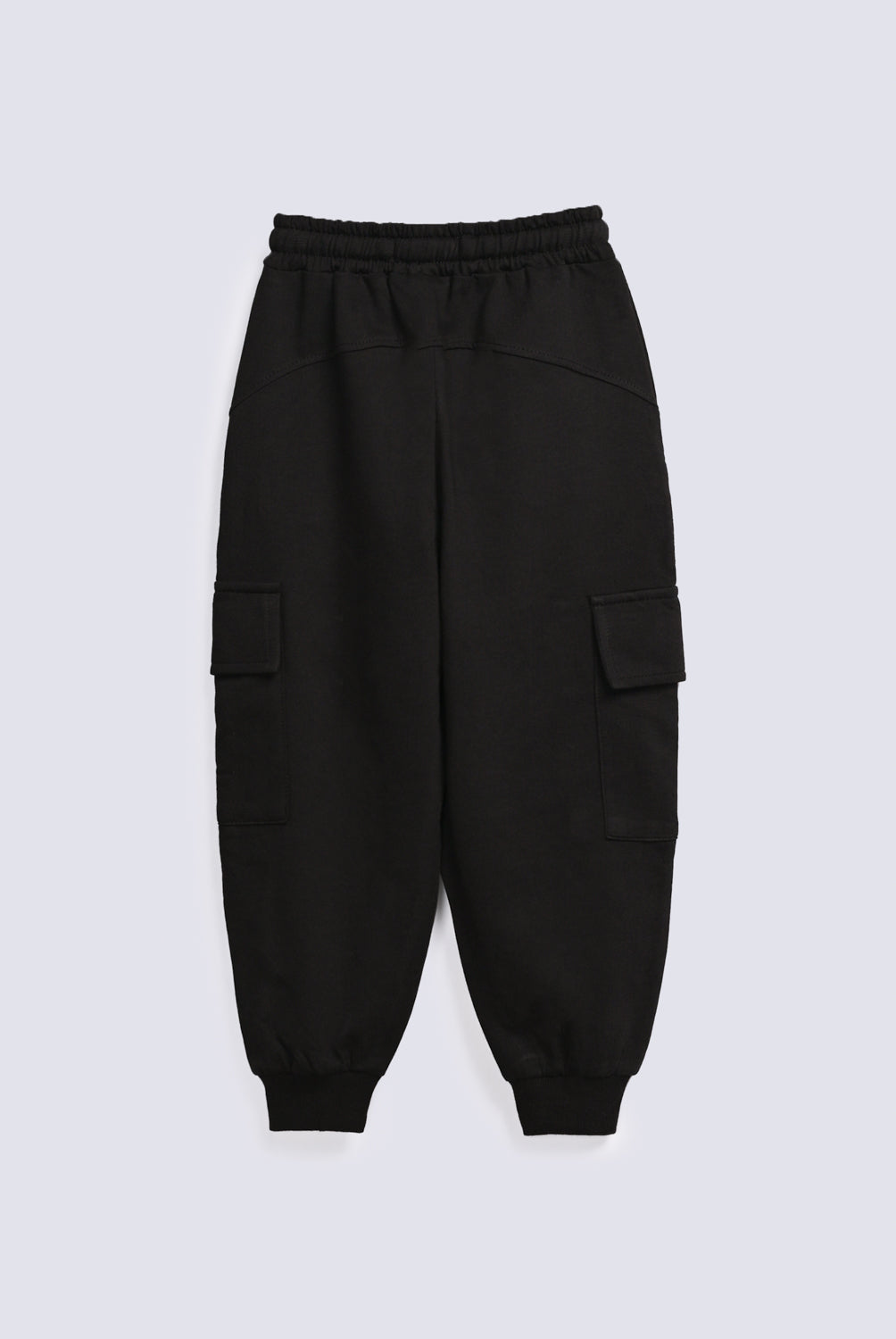 Black jogger trousers with an elasticated waist and big cargo pockets on the sides.