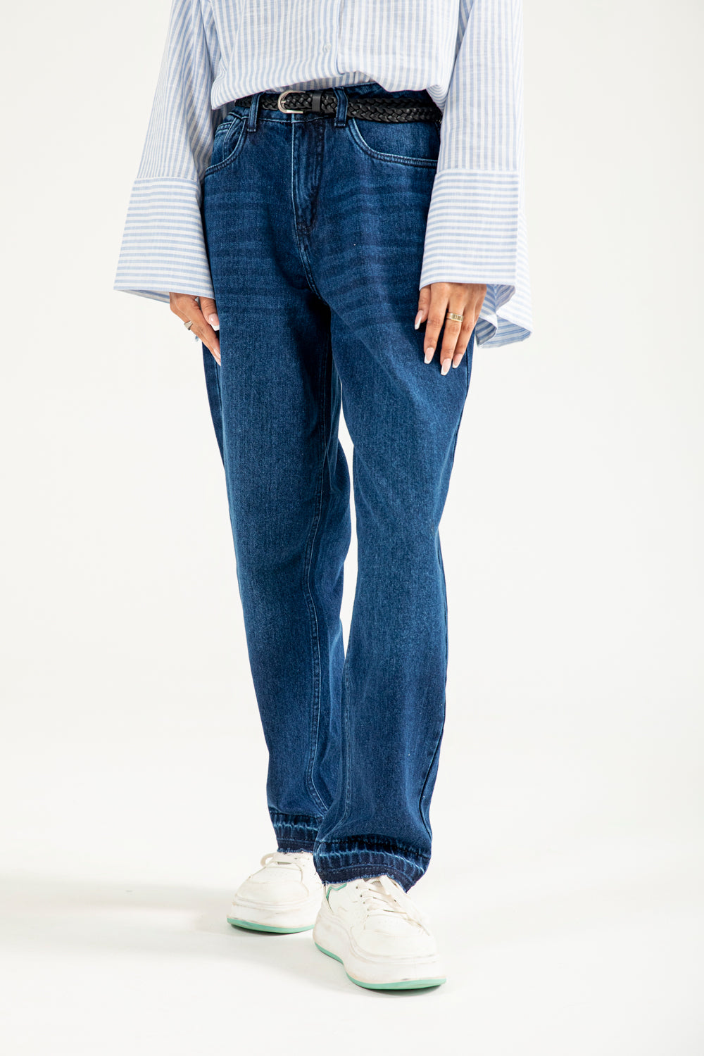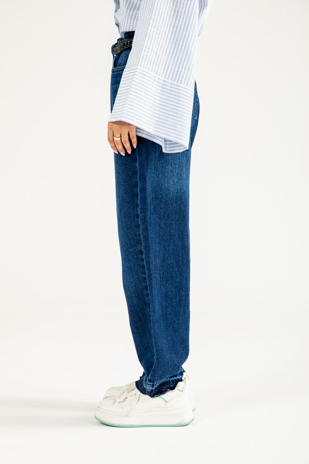 Classic blue denim in a cotton fabric, designed with a roomy barrel leg silhouette for a modern relaxed fit.