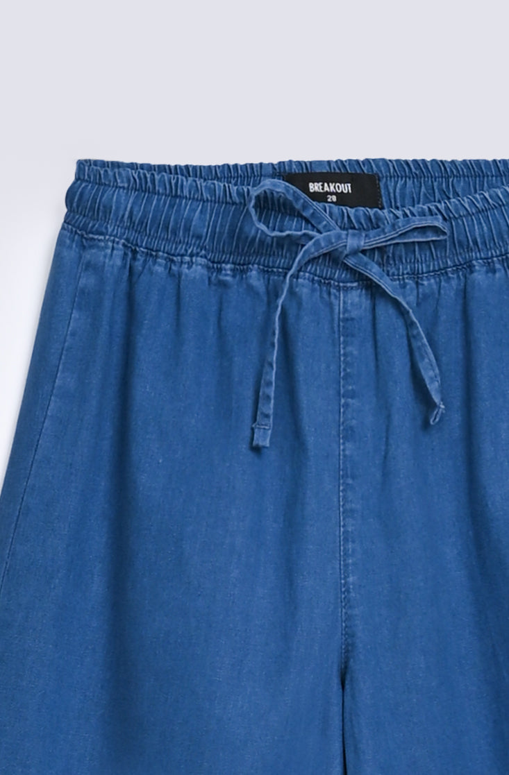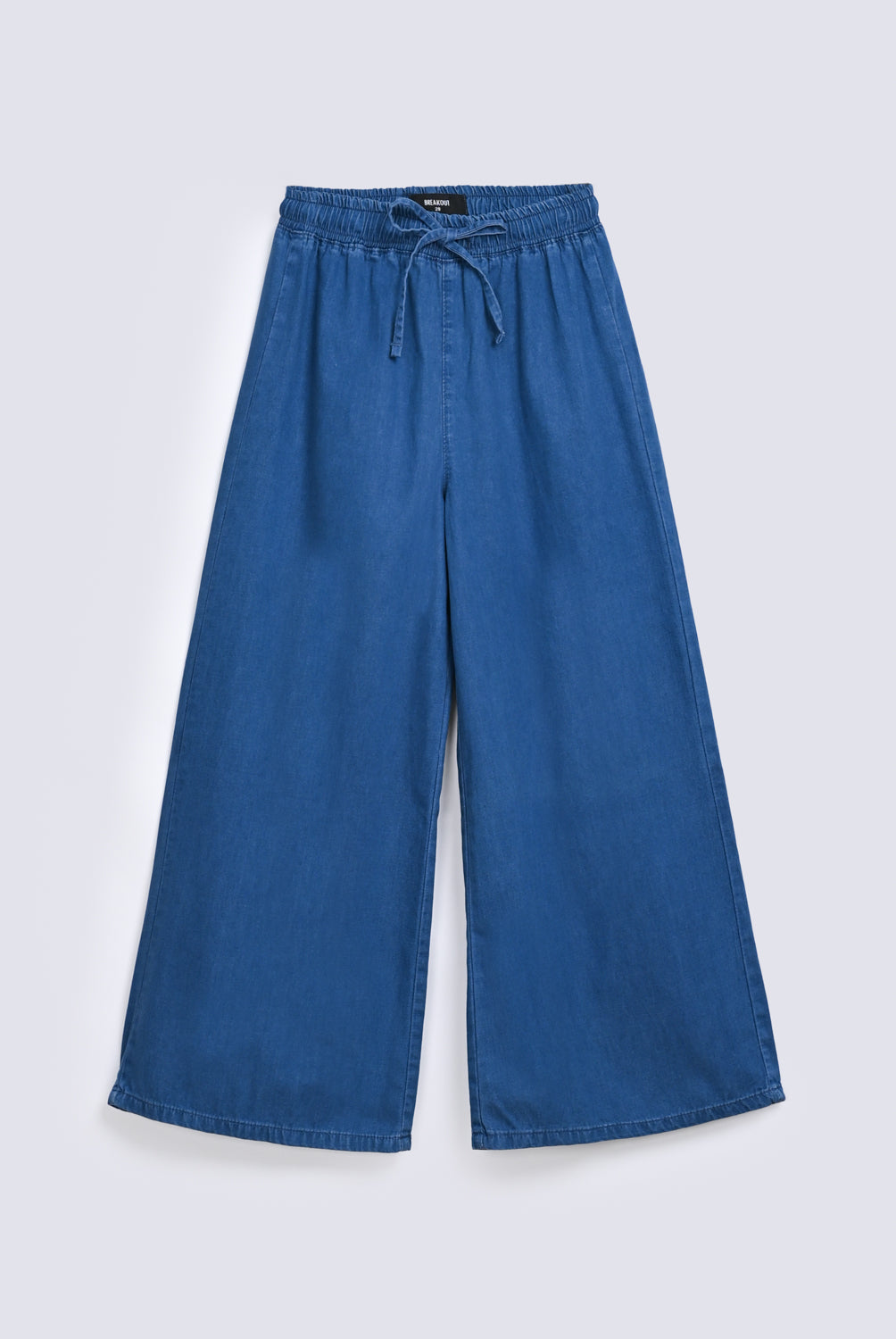Blue denim trousers with a wide leg fit, finished with an elasticated drawstring waistband.