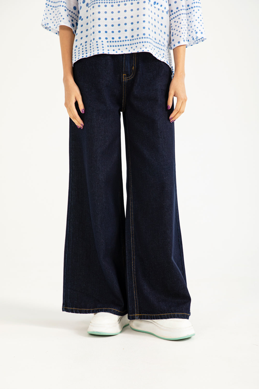 Crafted from dark blue cotton denim, this ultra wide fit style is accented with bold yellow thread stitching.