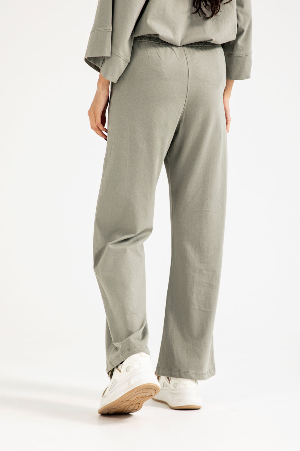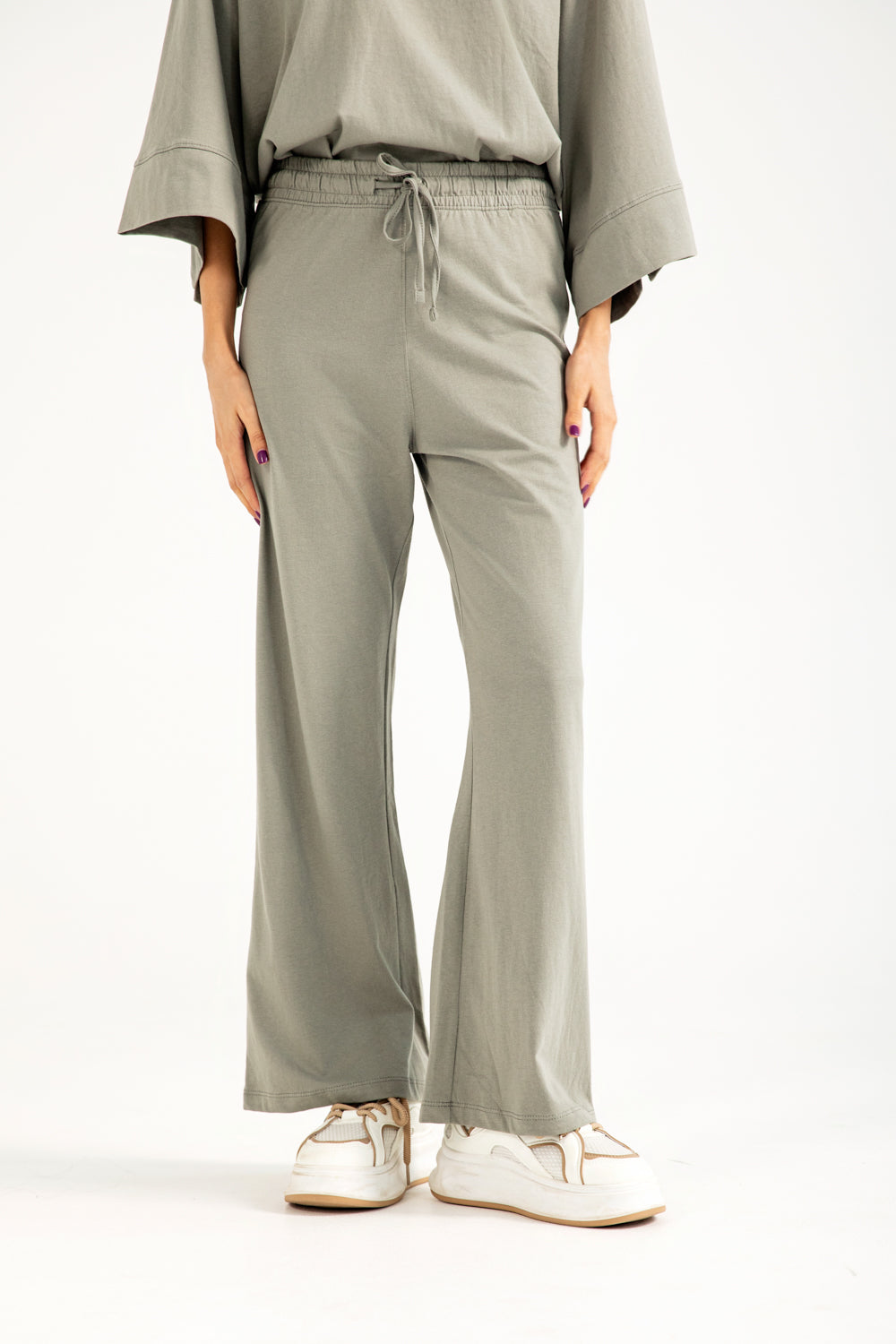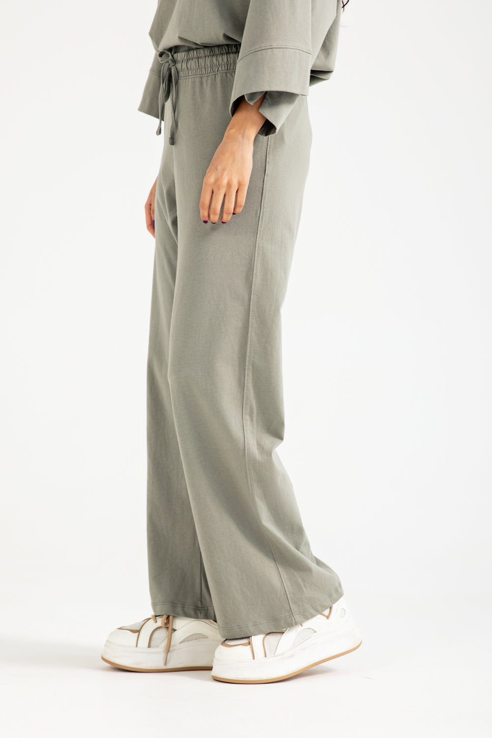Plain grey wide leg trousers in stretchy cotton with an elasticated drawstring waistband.