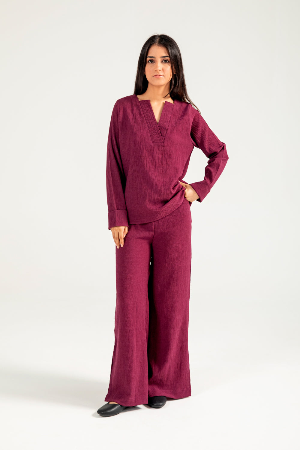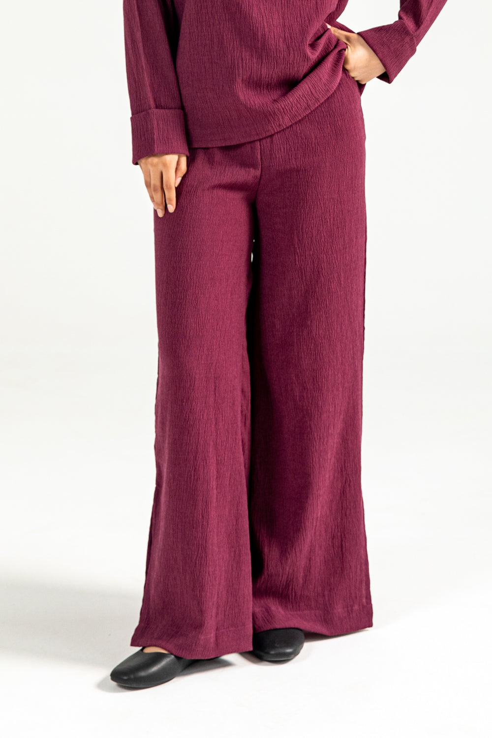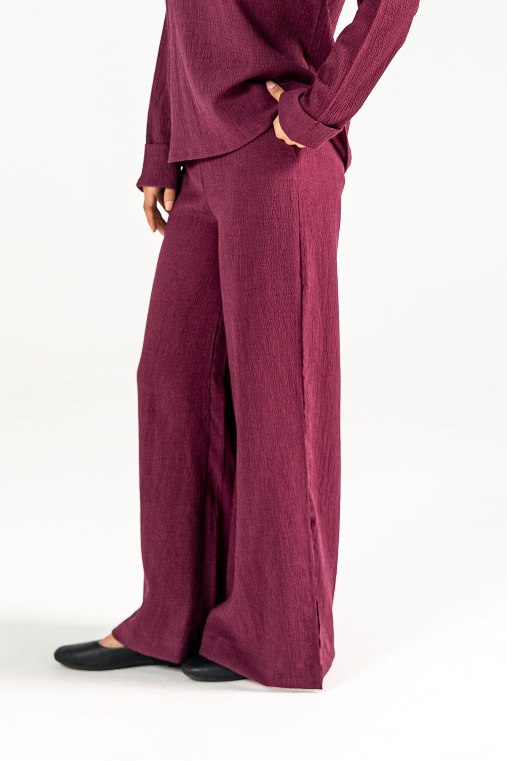 Plum wide-leg trousers in a flowy synthetic blend with a textured finish for added depth.