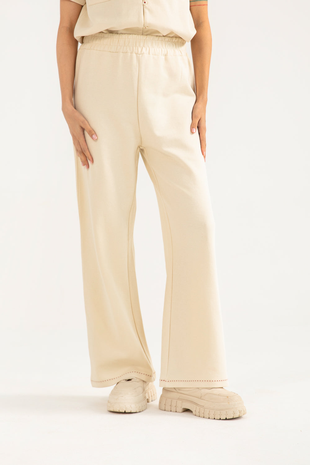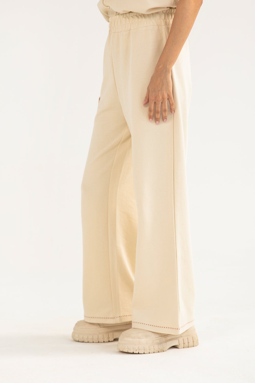 Wide leg trouser in beige crafted from a cotton blend with an easy elasticated waistband.