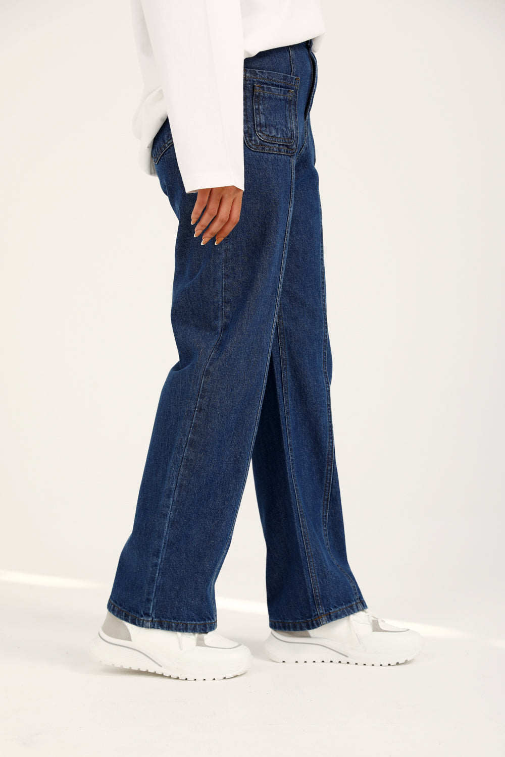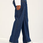 Blue straight fit denim featuring front pocket detail and seam lines down the middle for a structured finish.