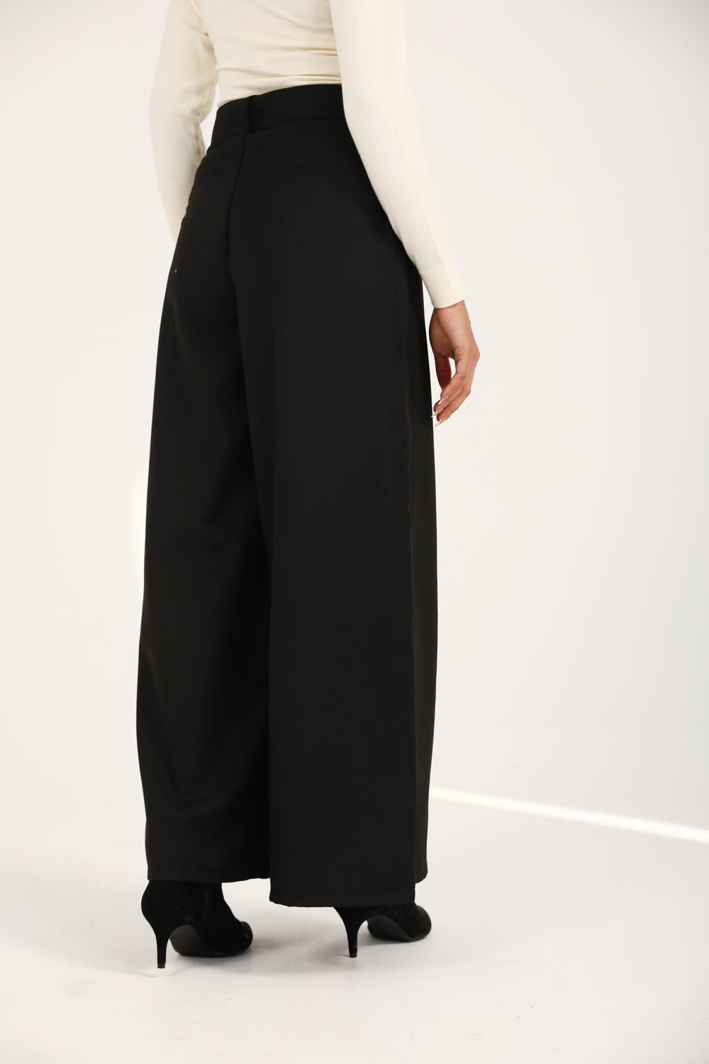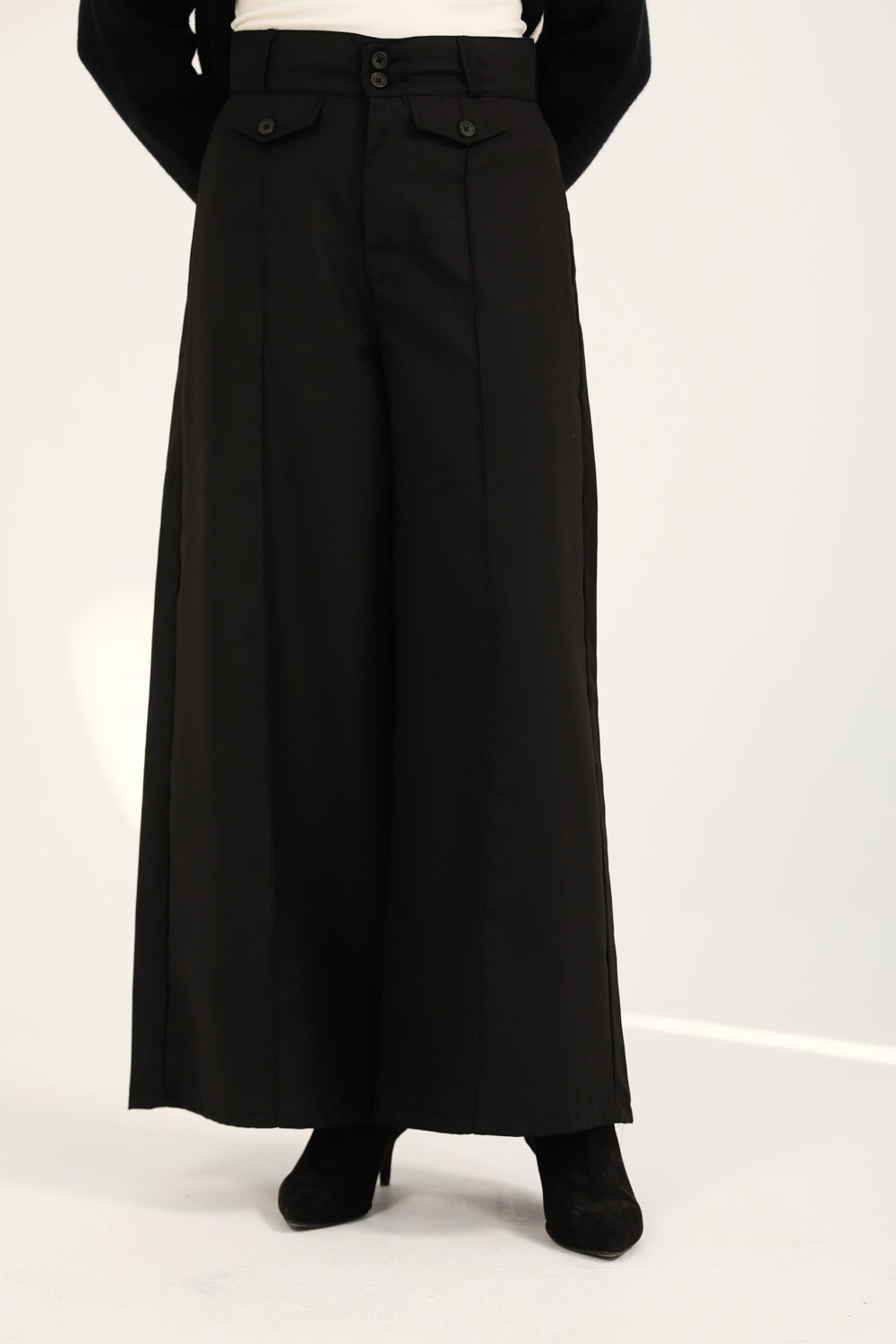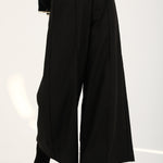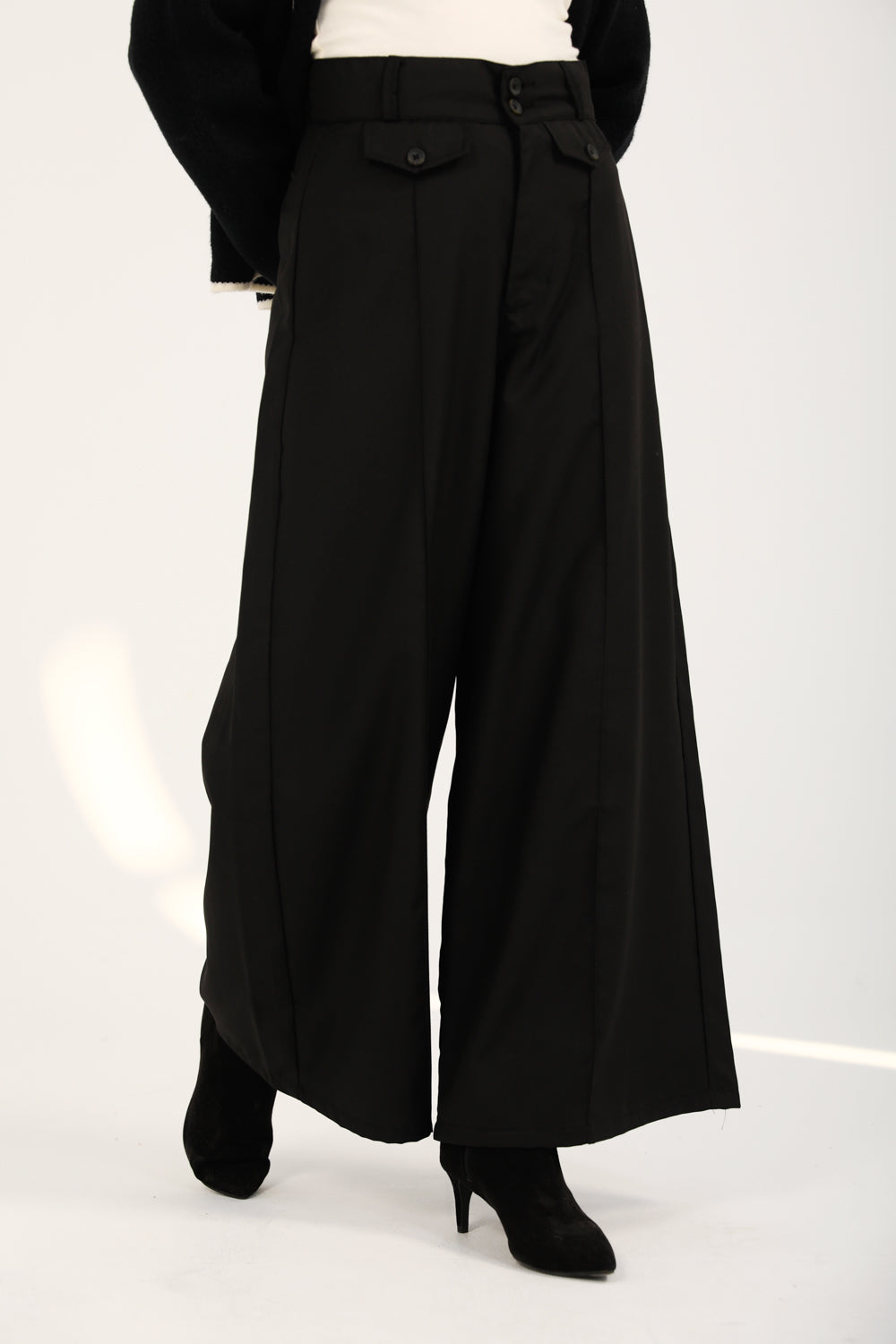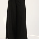 Black mega wide pants featuring front seams, flap detailing, and a two-button waistband.