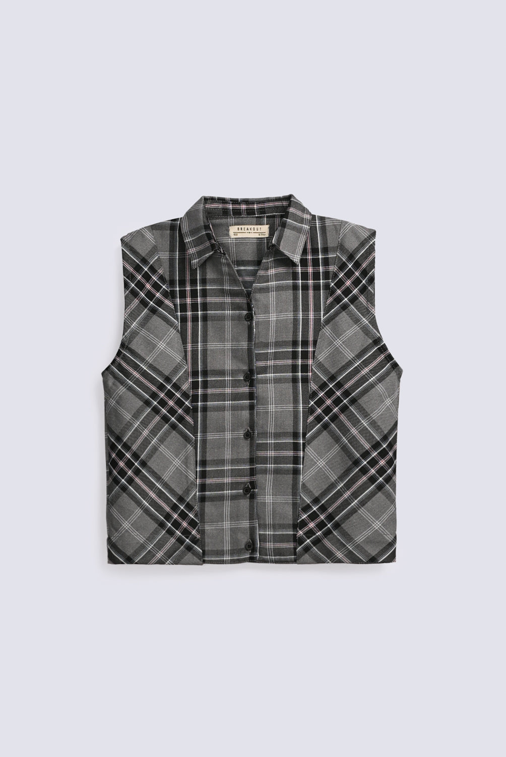 A sleeveless button-down in classic black and grey checks, finished with matching buttons for a neat look.