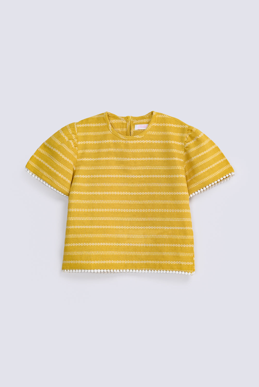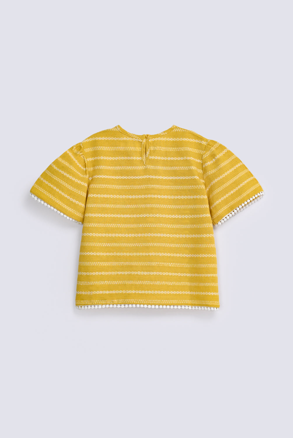 Charming and comfy, this jacquard top with patterned stripes, short sleeves, and a back button closure is perfect for sunny days!