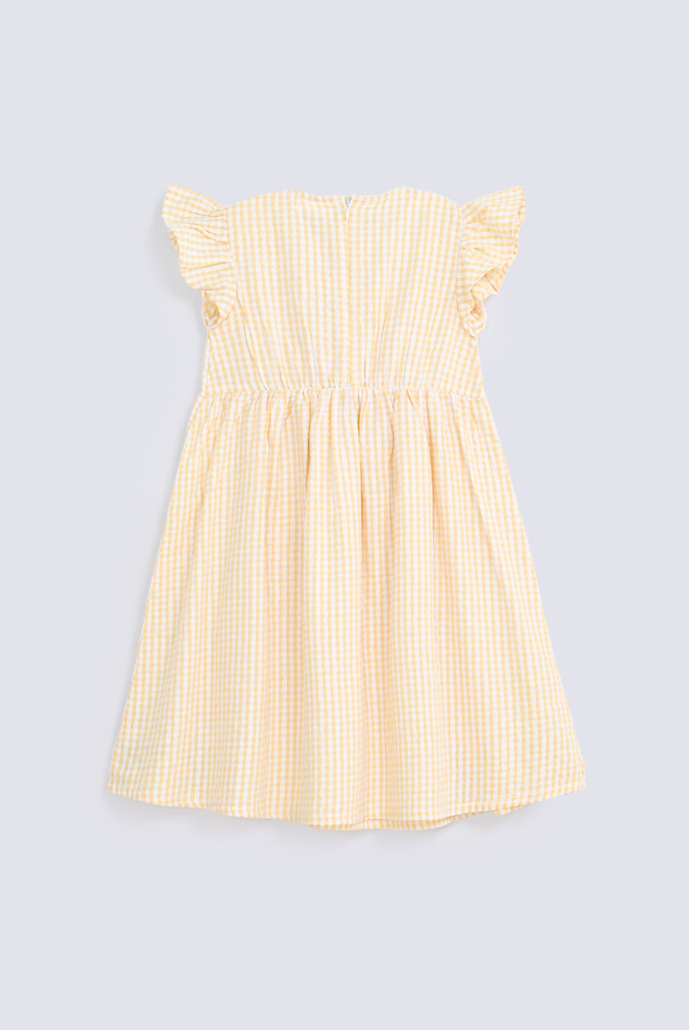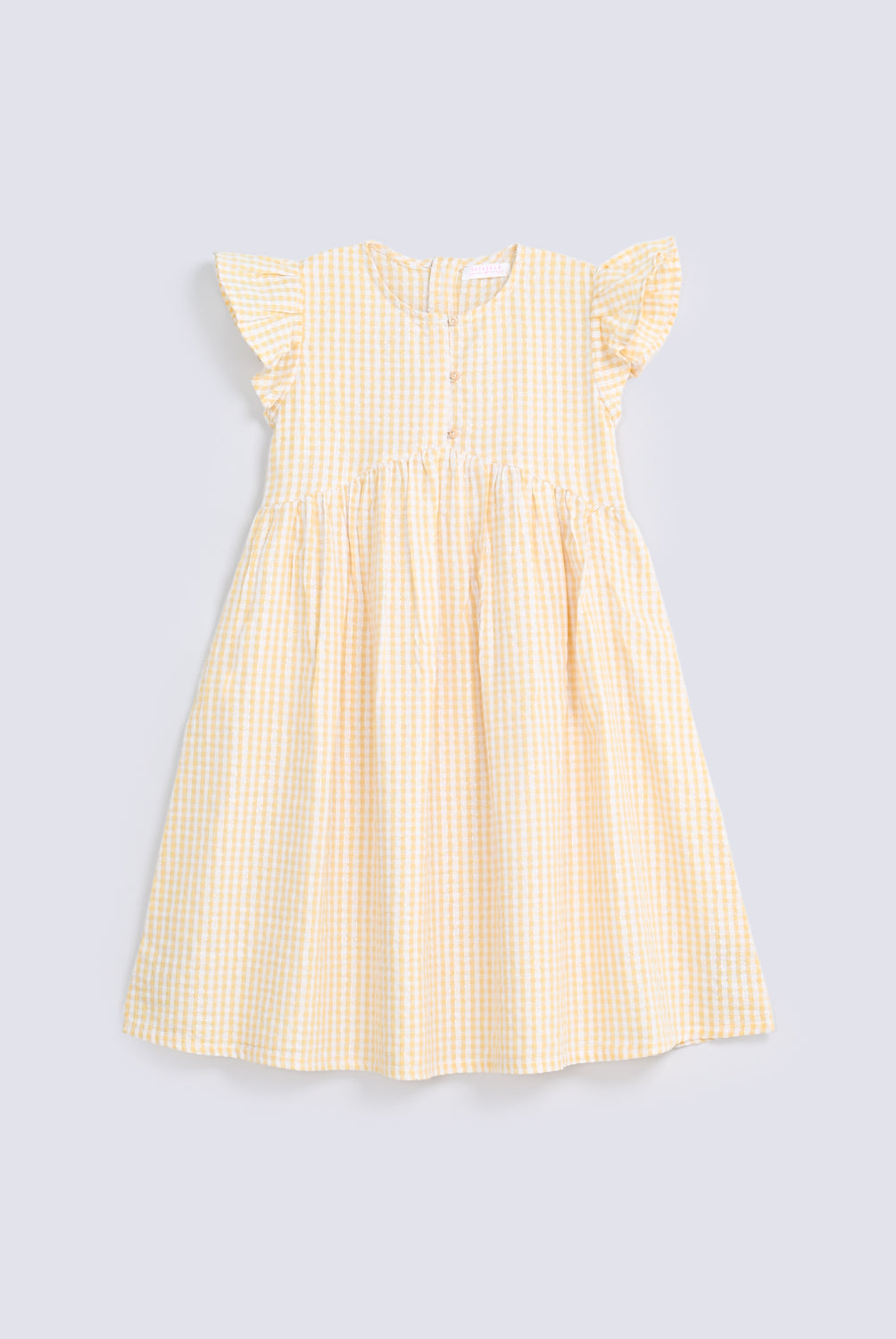 Covered in yellow and white checks, this long dress features frill sleeves, tiny matching buttons, soft gathers above the waist, and a hidden zipper at the back for a neat finish.