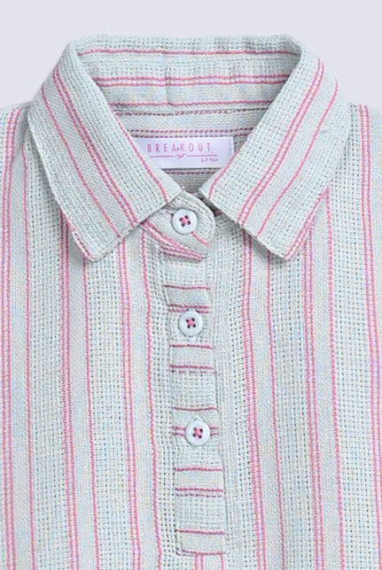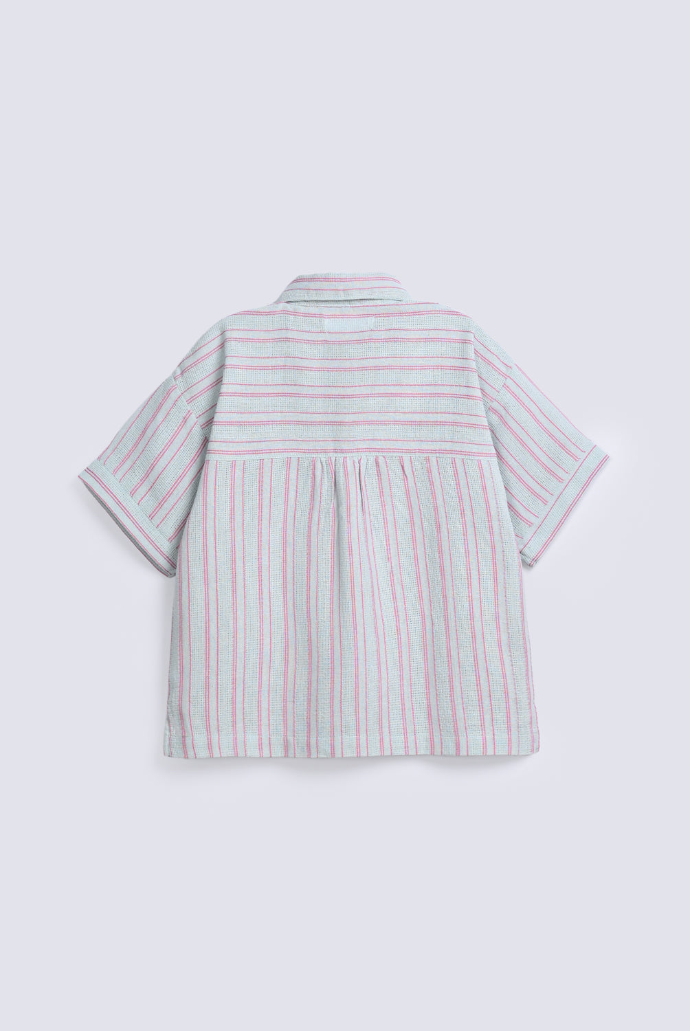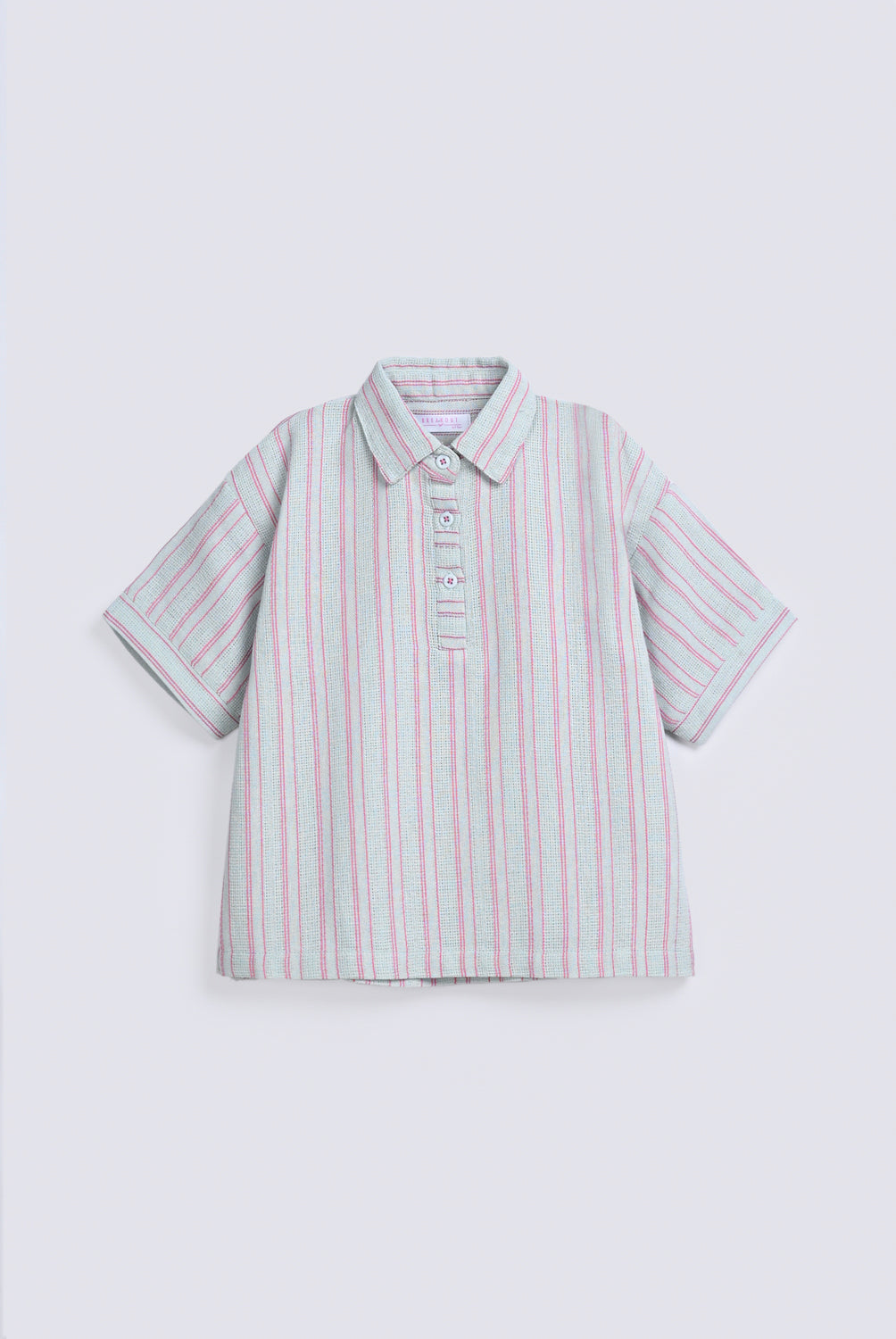 A relaxed boxy silhouette featuring muted green and pink vertical stripes with neatly matching buttons.