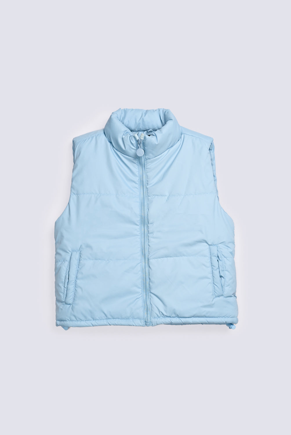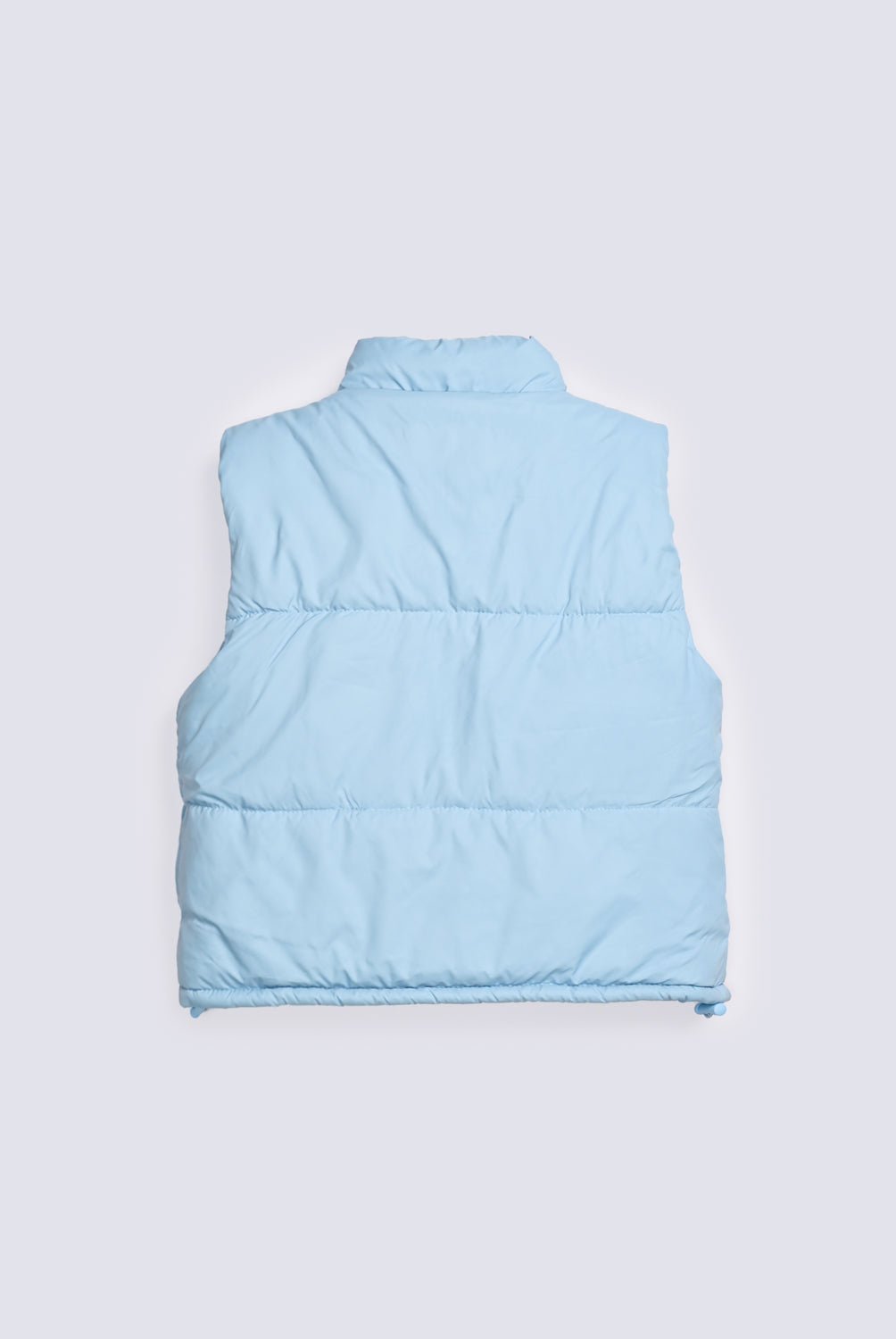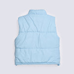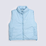 Light blue puffer with a sleeveless design, cozy welt pockets, and a smooth zipper closure.