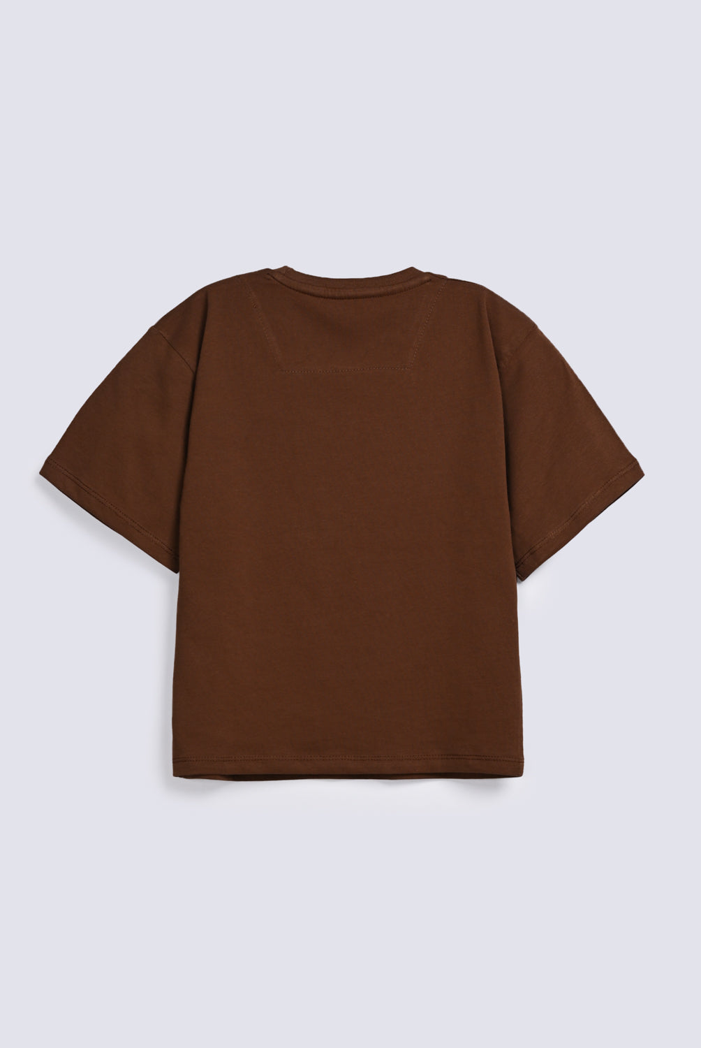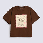 Brown tee with a bold beige and pink print, filled with cheerful affirmations and playful doodles.