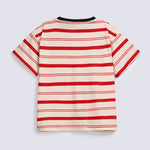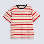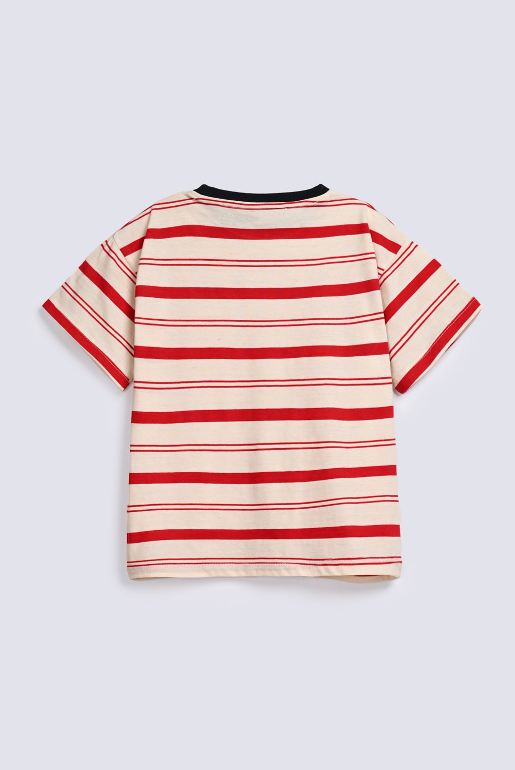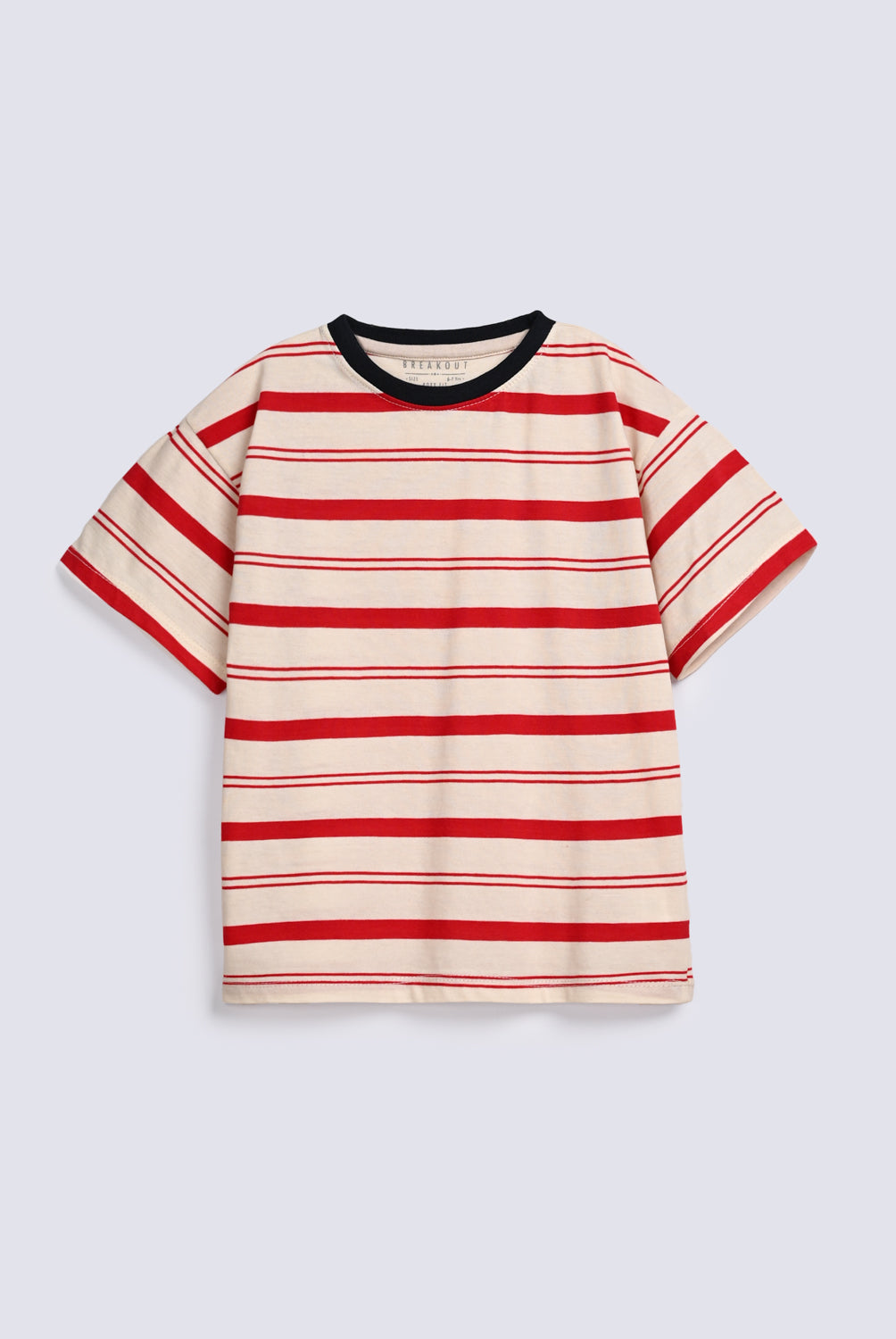 Ecru tee with bold red stripes and a boxy fit, full of bright, energetic color.