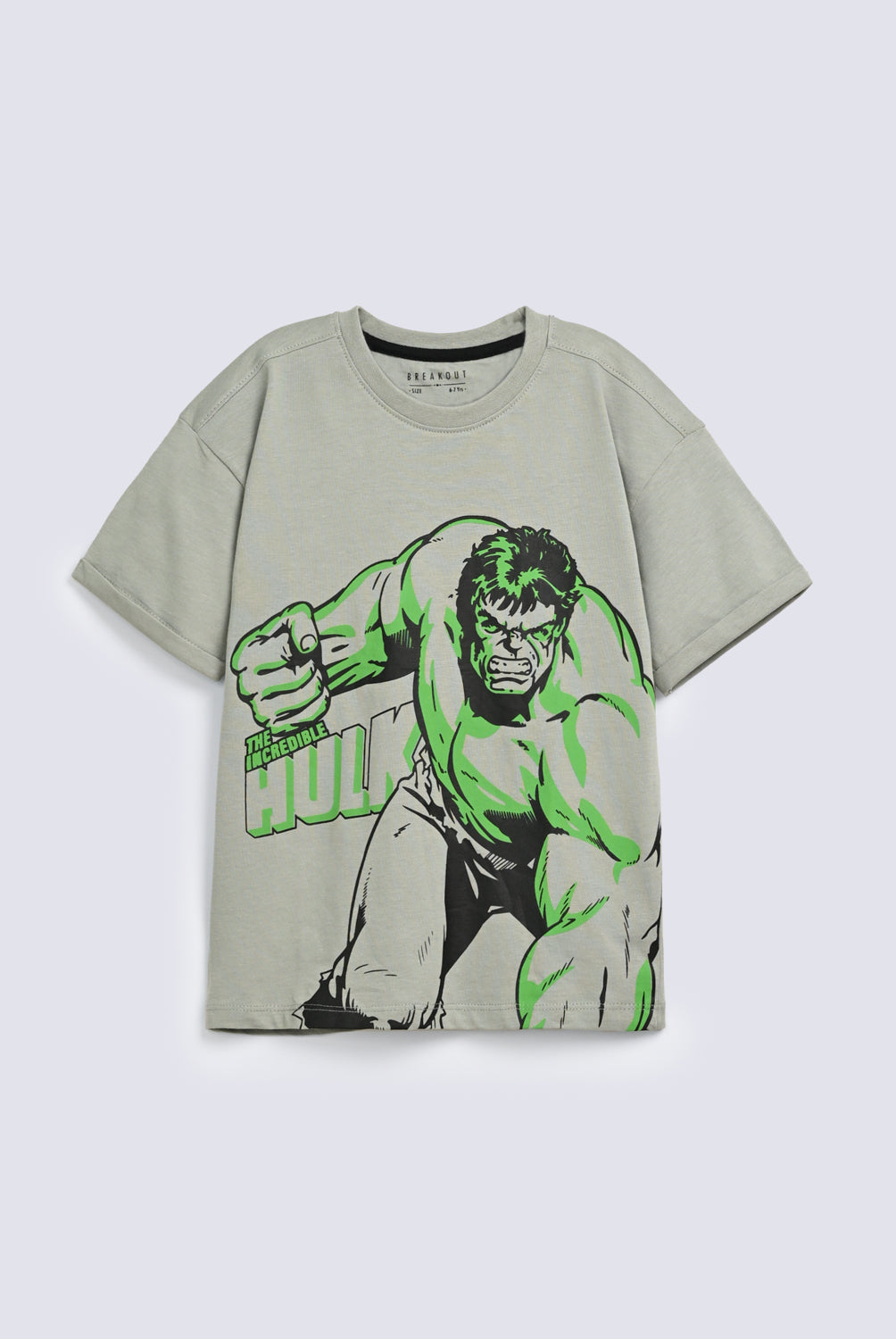 Green drop shoulder tee with a big comic book Hulk on the front, bringing superhero action to every outfit.