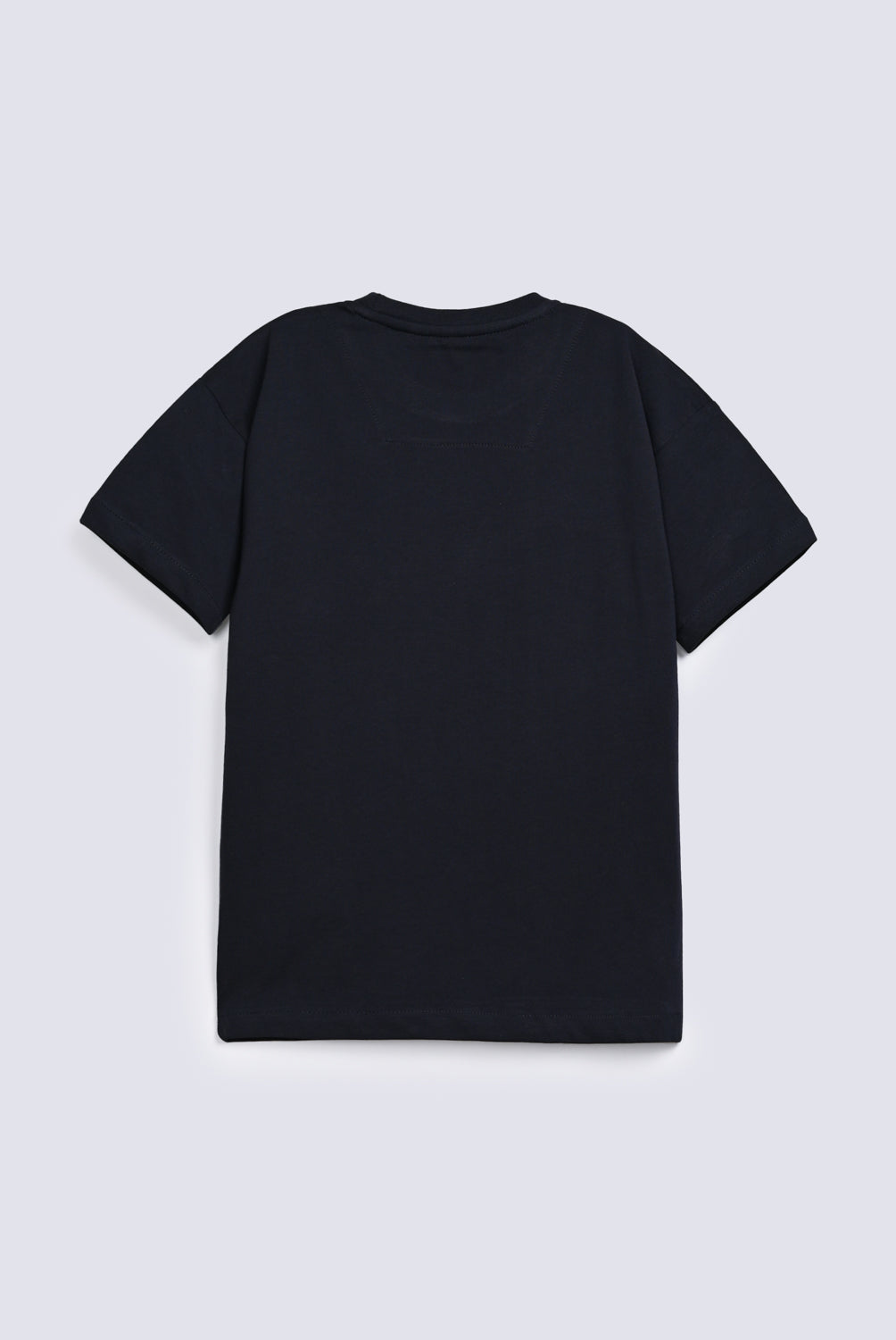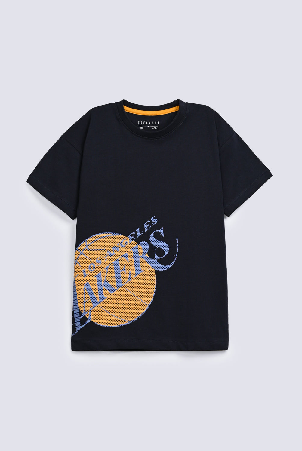 Navy tee with a loose drop shoulder fit and a big LA Lakers print on the front, made for little sports fans.