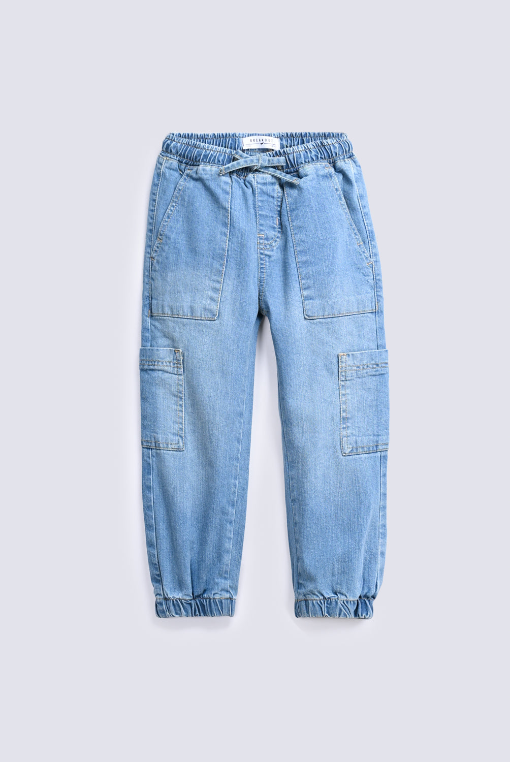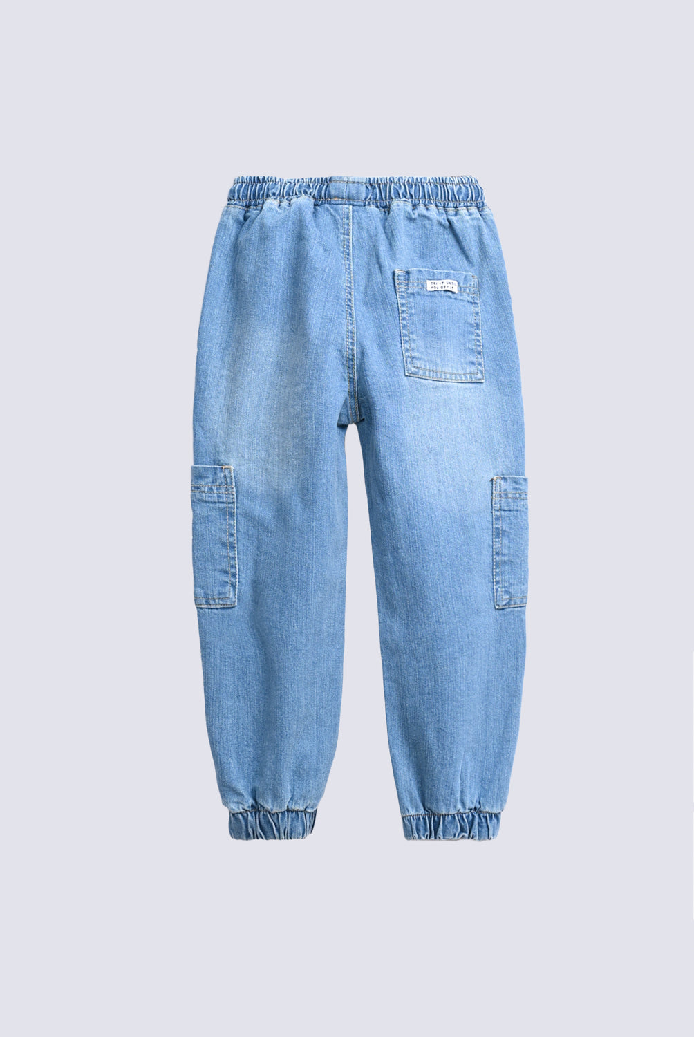 Light blue joggers with oversized cargo and side pockets, an easy pull-on waistband, and stitched details.