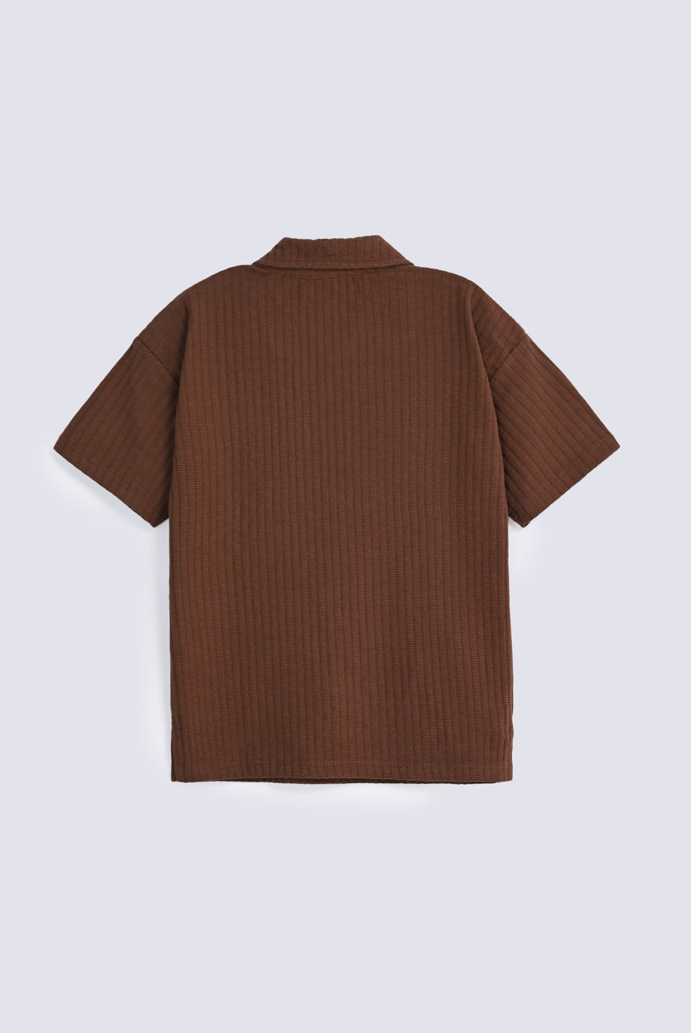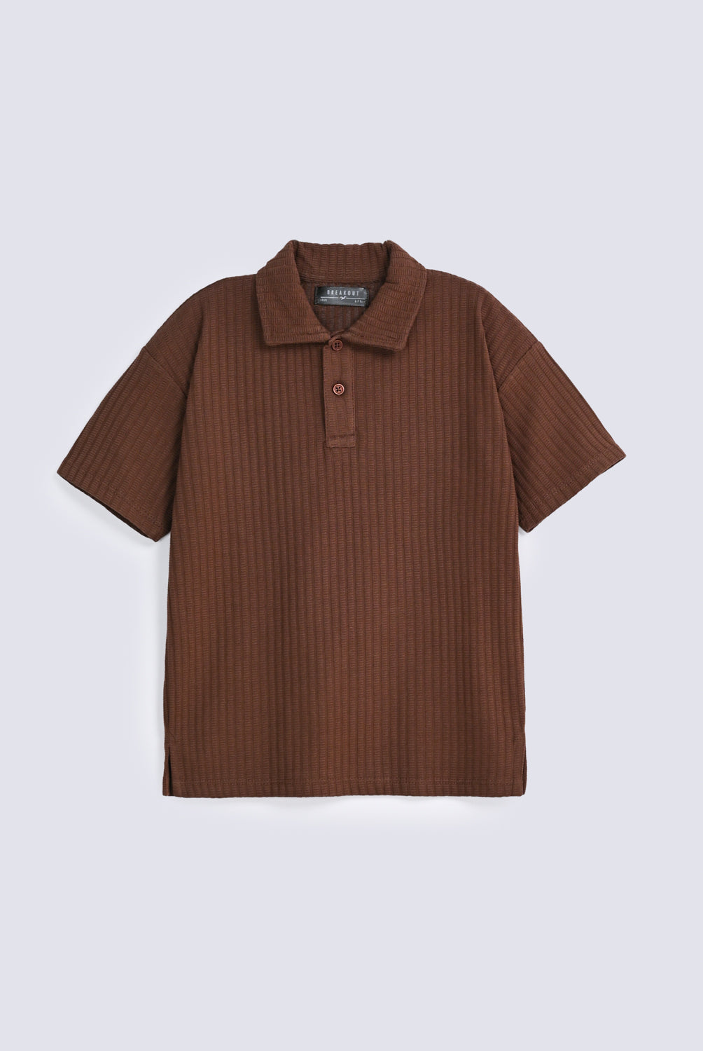 This brown polo stands out with its soft textured knit, relaxed drop shoulder fit, and a neat two button placket that keeps the look clean.