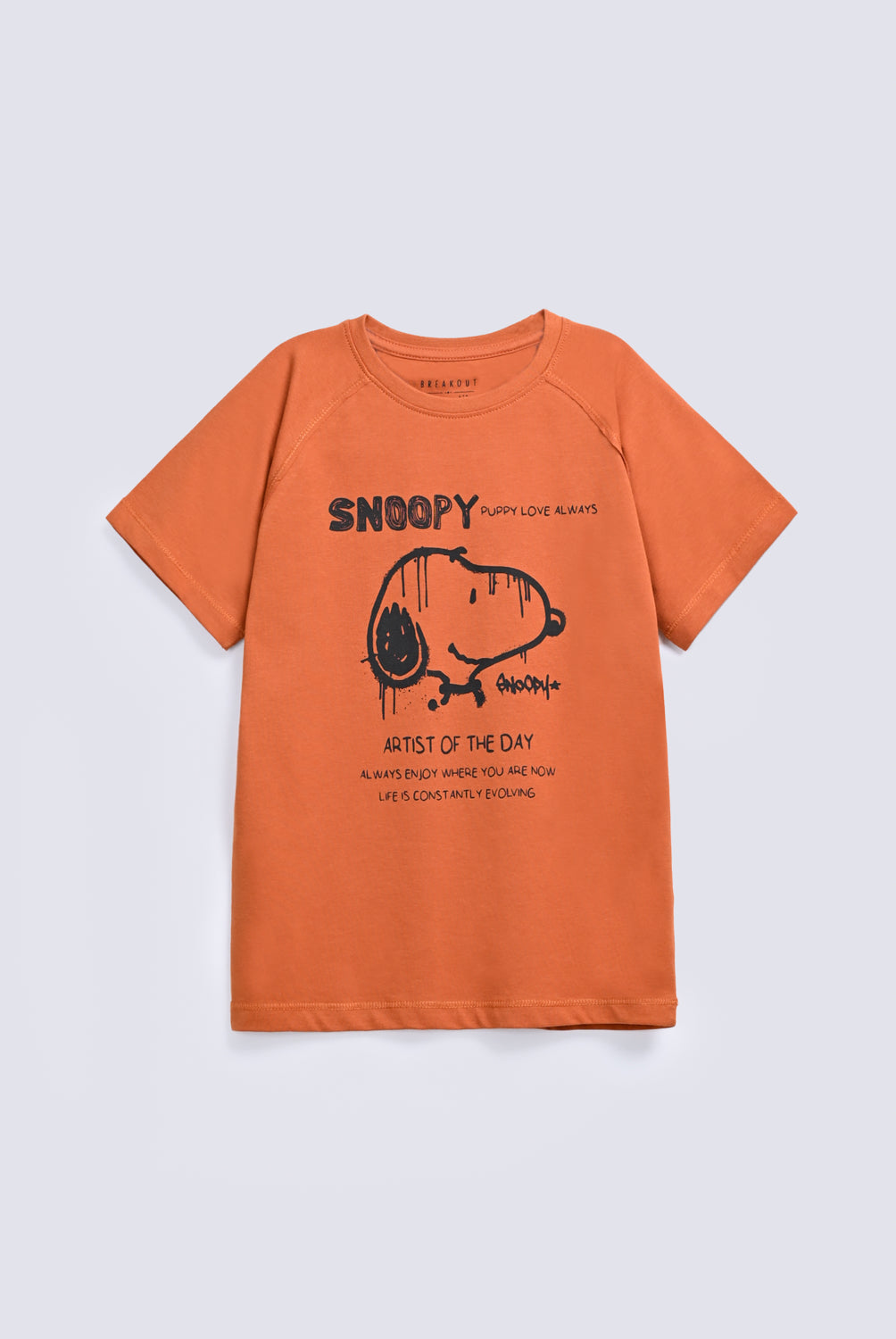 Rust colored tee with contrast raglan sleeves and a graffiti style Snoopy print on the front for a playful edge.