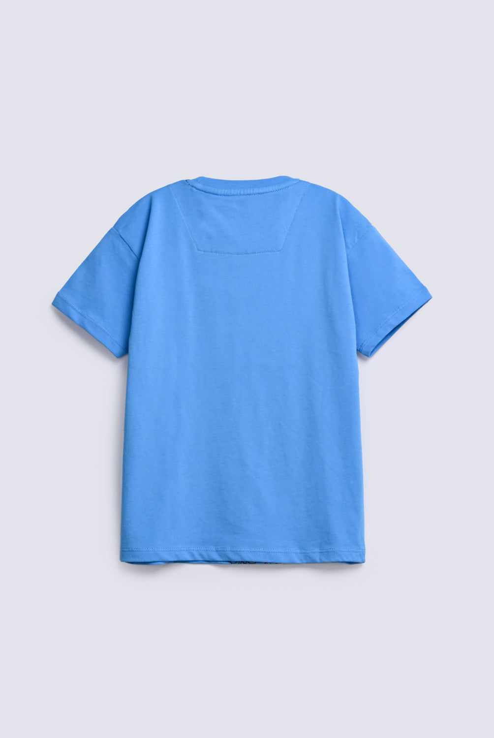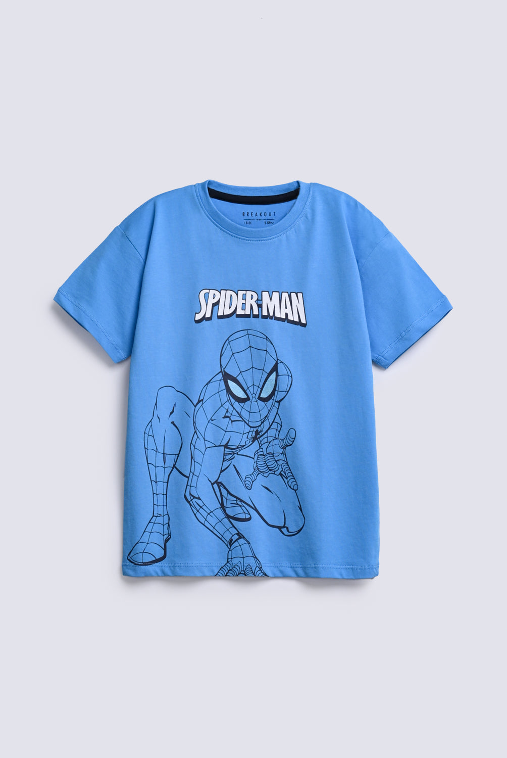 Blue cotton tee with a relaxed drop shoulder fit and a striking black and white Spiderman print that takes over the front in full superhero style.