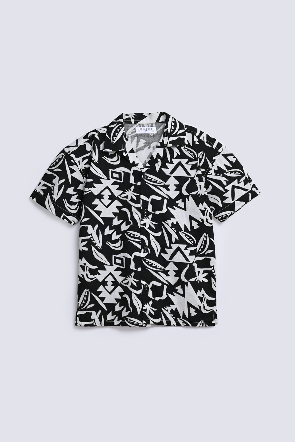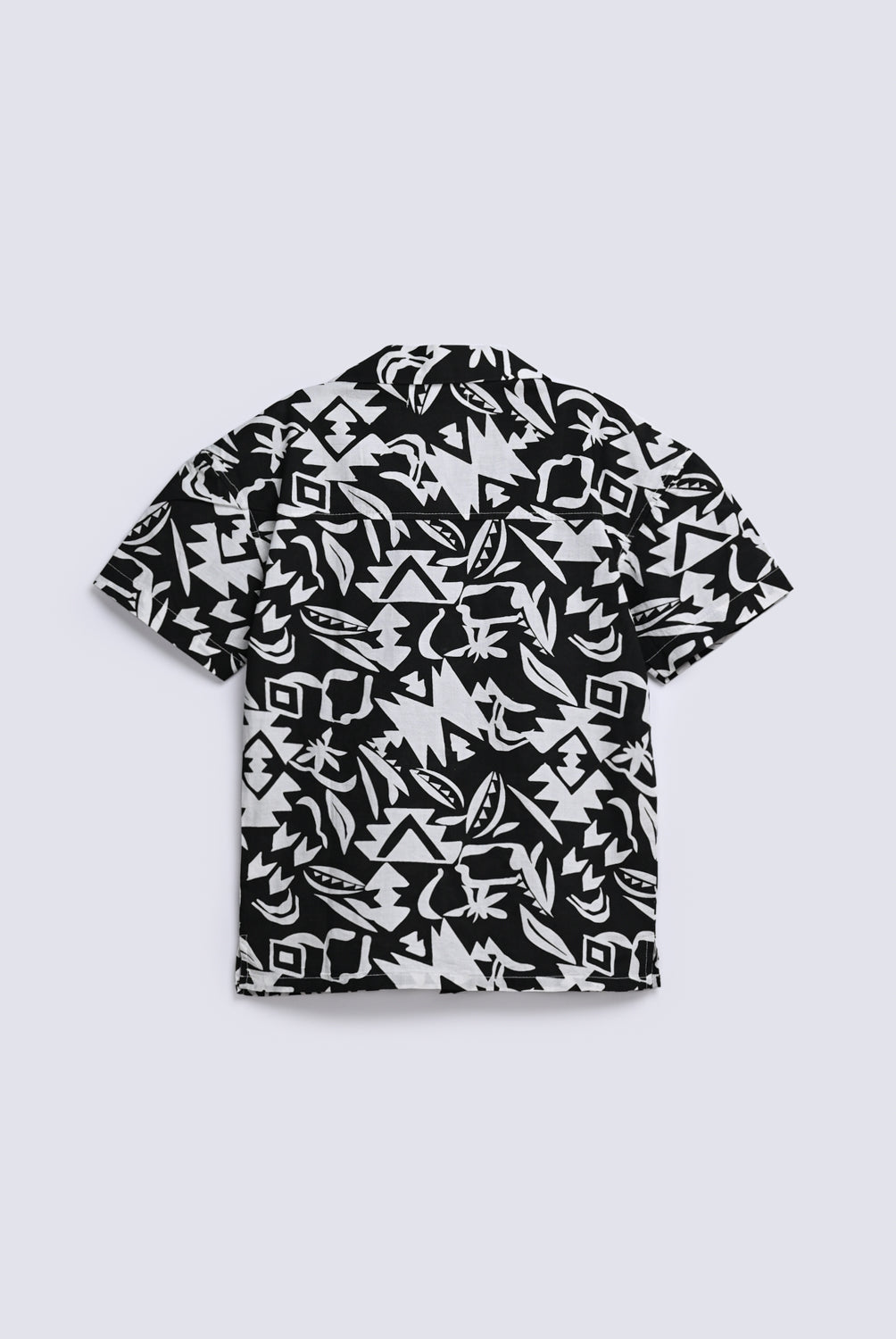 Bold and relaxed, this drop shoulder shirt features an all over geometric abstract print with black buttons that tie the whole look together.