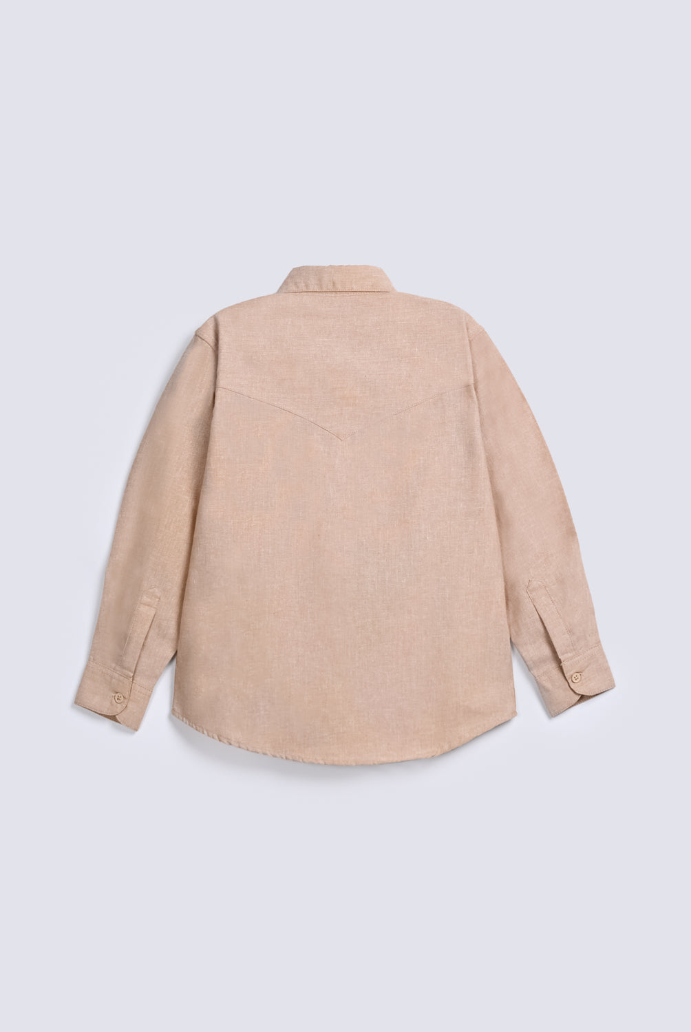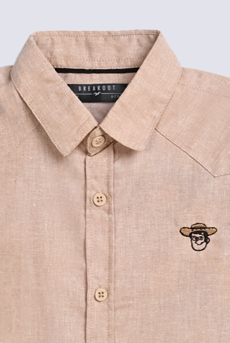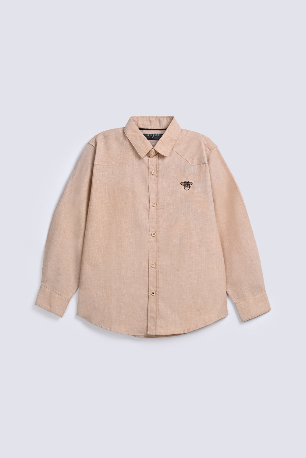 A simple beige top with full sleeves featuring a tiny woody embroidery on the left side and beige buttons.