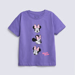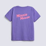 Purple cotton tee with playful Minnie Mouse prints on the front and her name splashed in pink across the back.