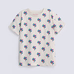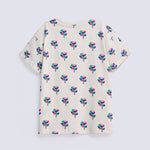 A soft ecru canvas scattered with multicolored flowers, finished with an easy drop shoulder cut.