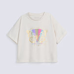This soft beige tee features a boxy fit and a shiny gold butterfly print floating in front of a rainbow, bringing a dreamy touch.