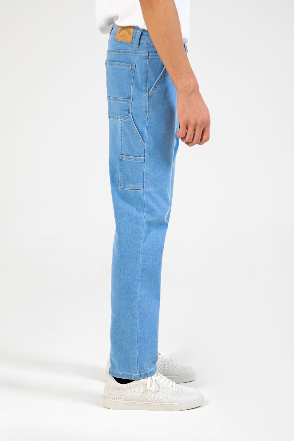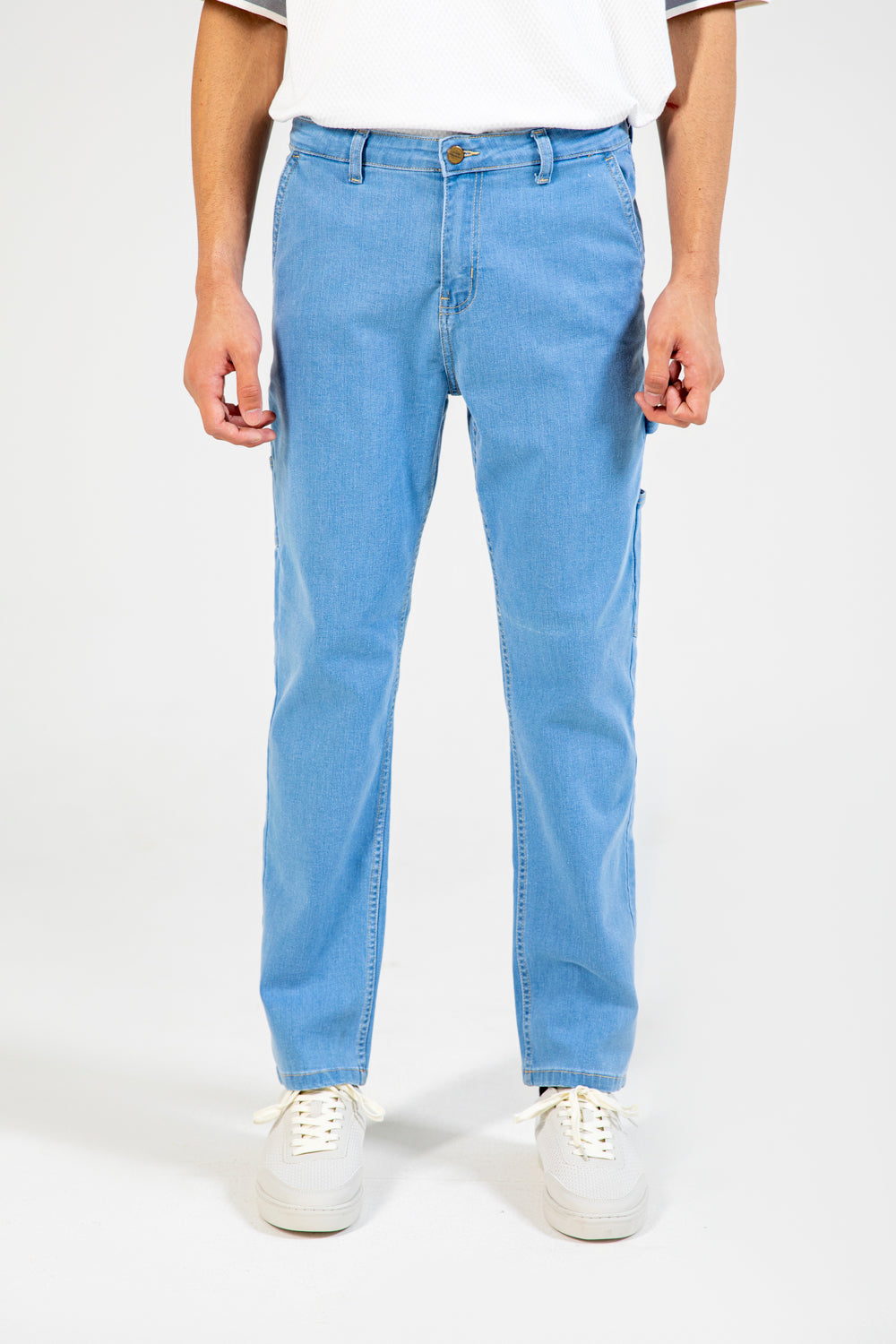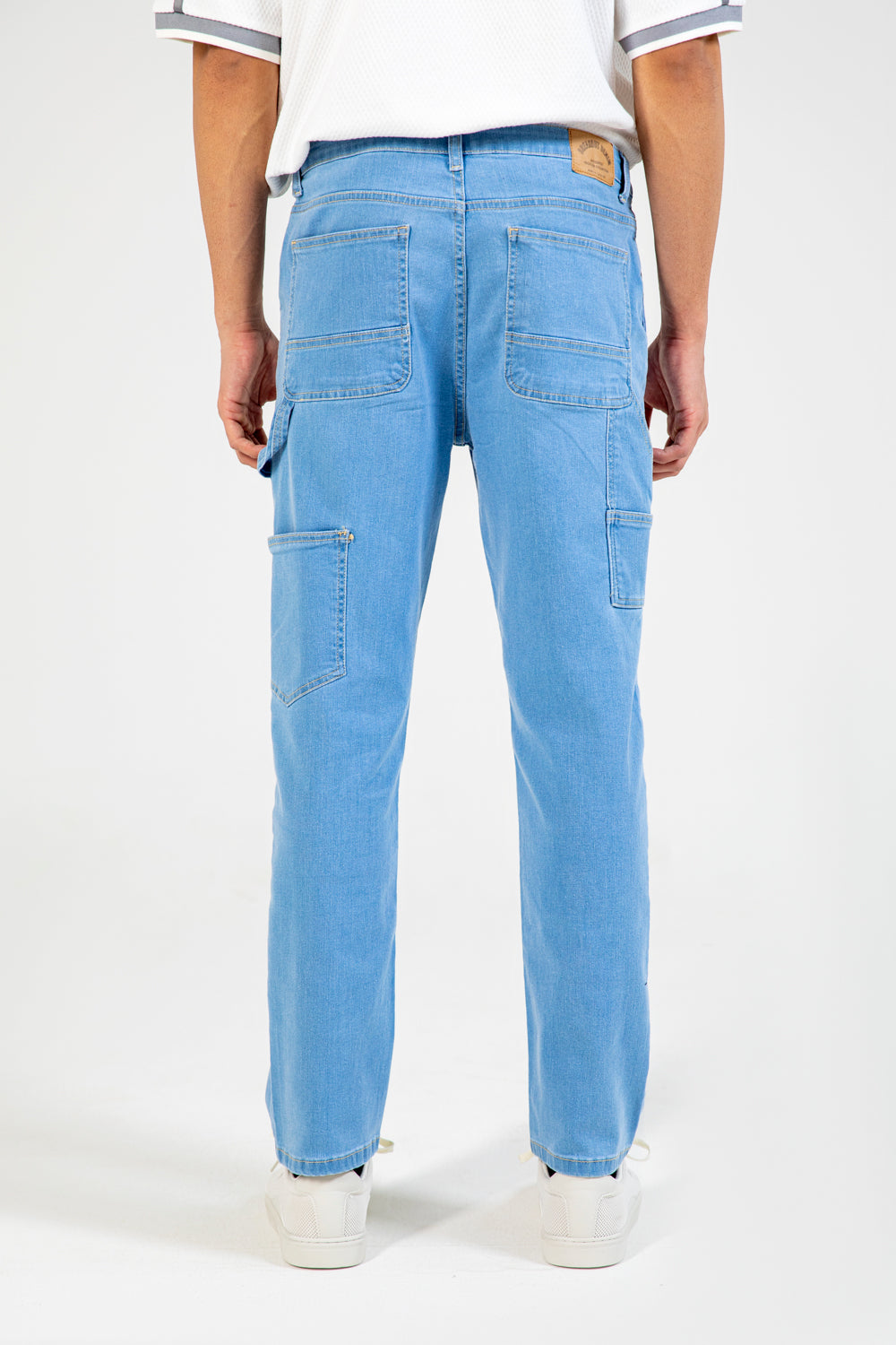 Blue cargo denim in a cotton blend with a slim relaxed fit.