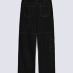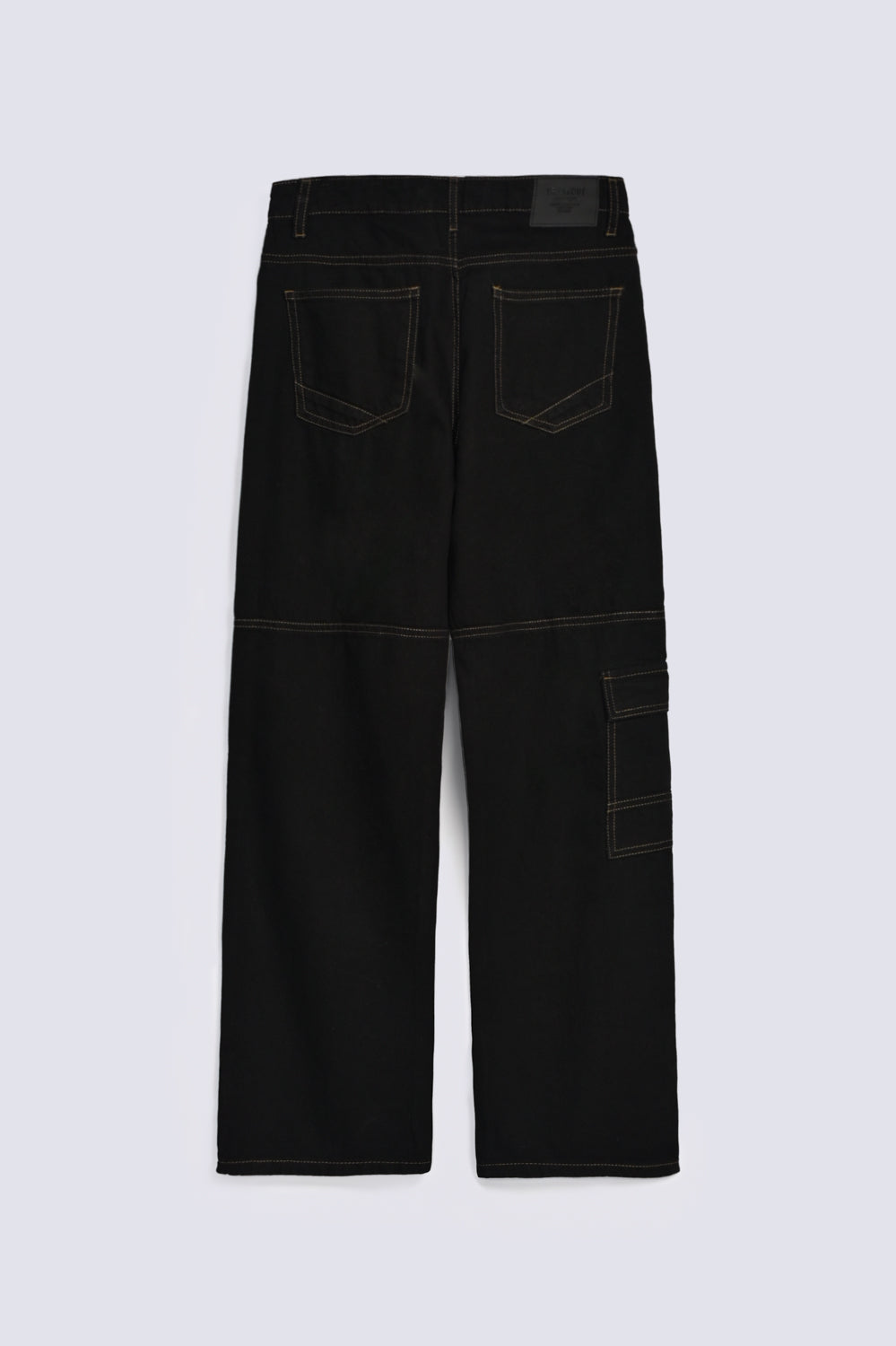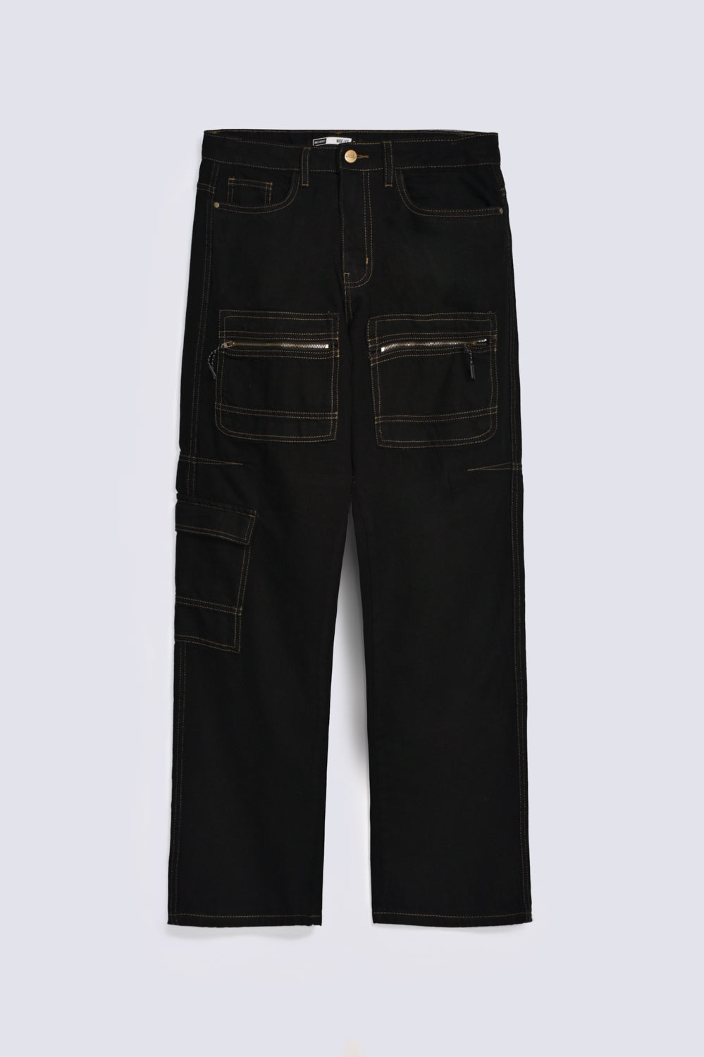 Straight-leg cargo jeans in dark denim, detailed with contrast stitching and bold utility zip pockets.