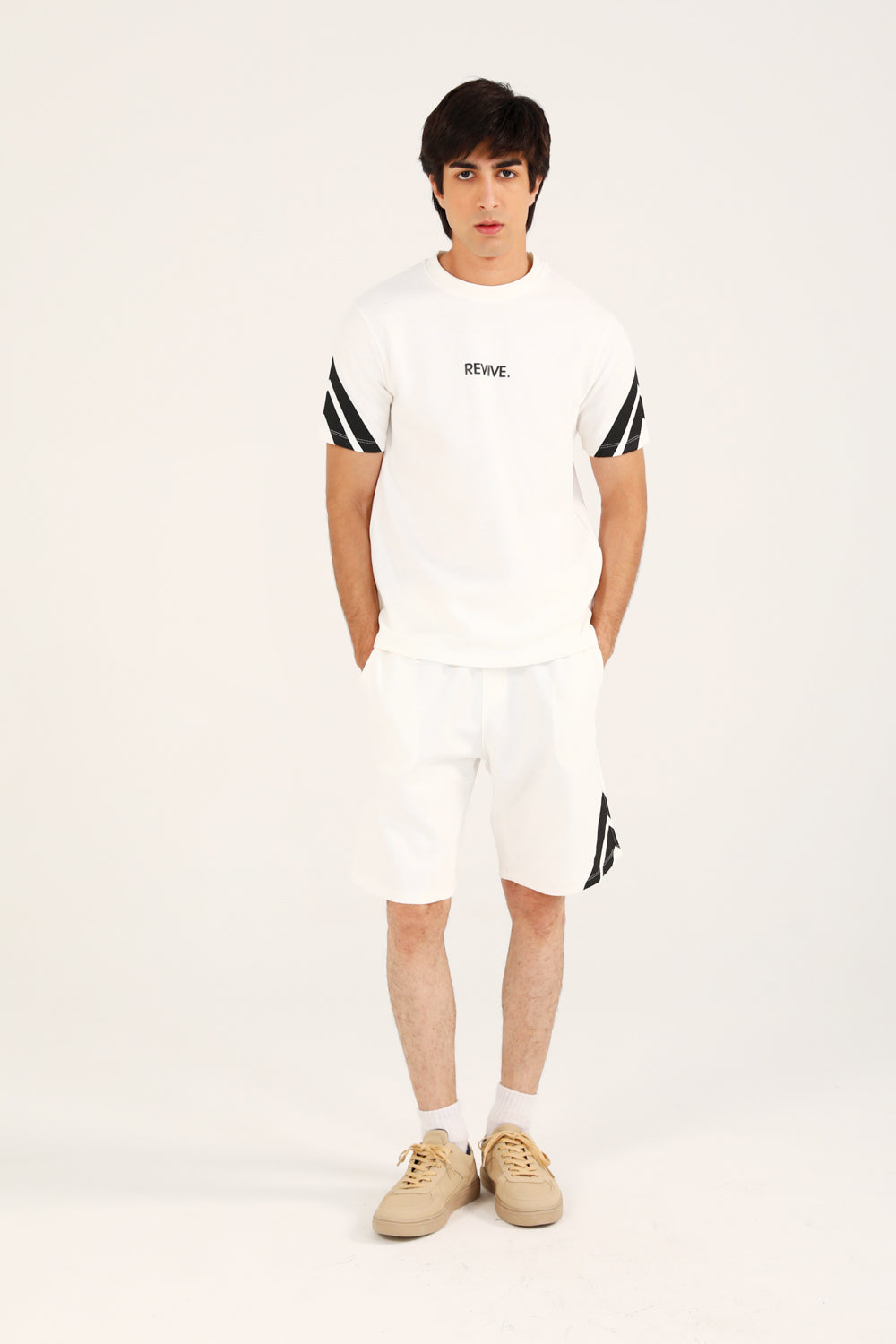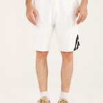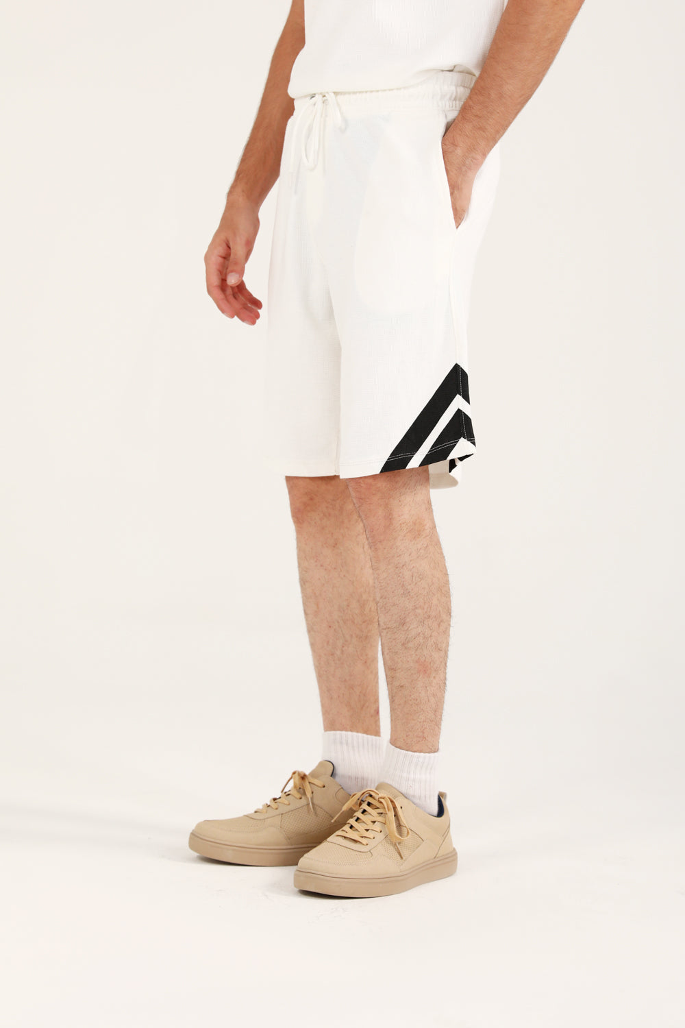 White knitted shorts in cotton with a drawstring waist and printed stripes near the hem that add an athletic touch.