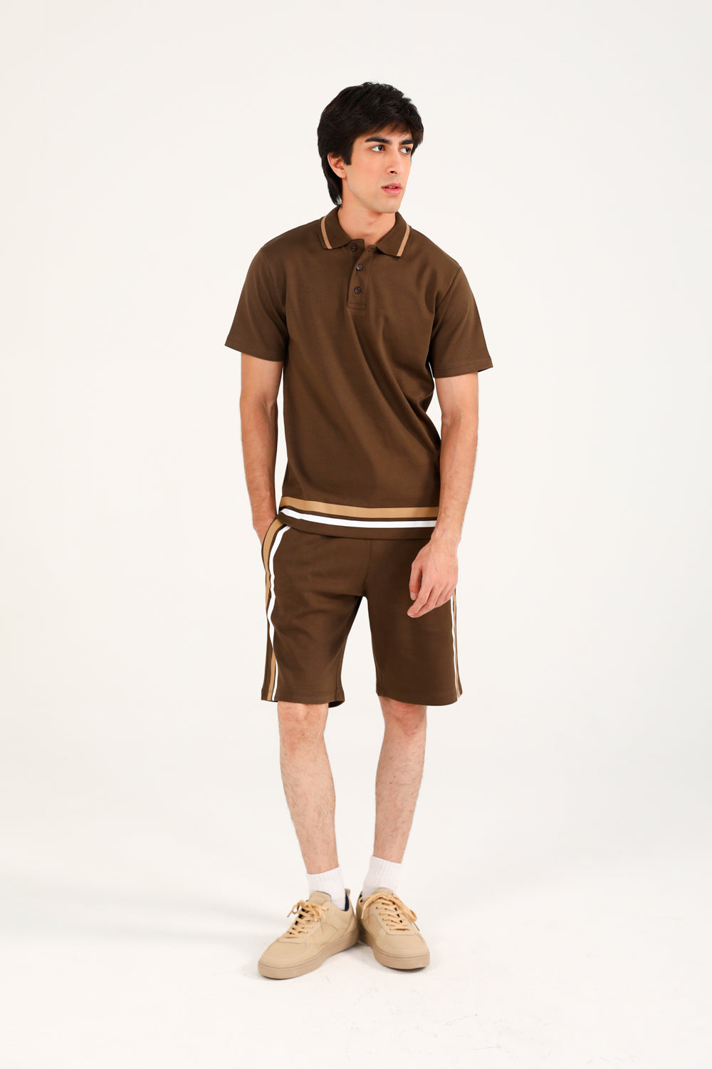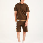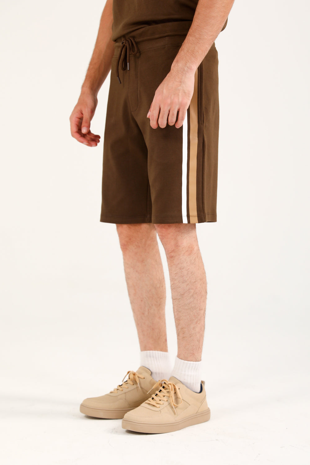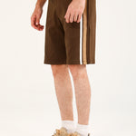 Brown knitted shorts in cotton with a drawstring waistband and striped sides that add a sporty touch to a laid-back style.
