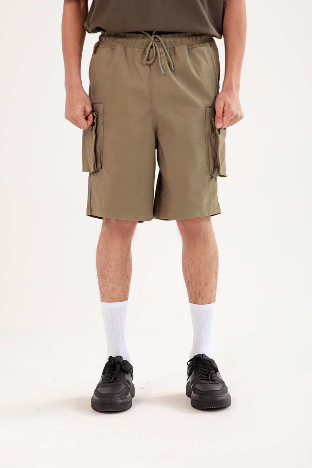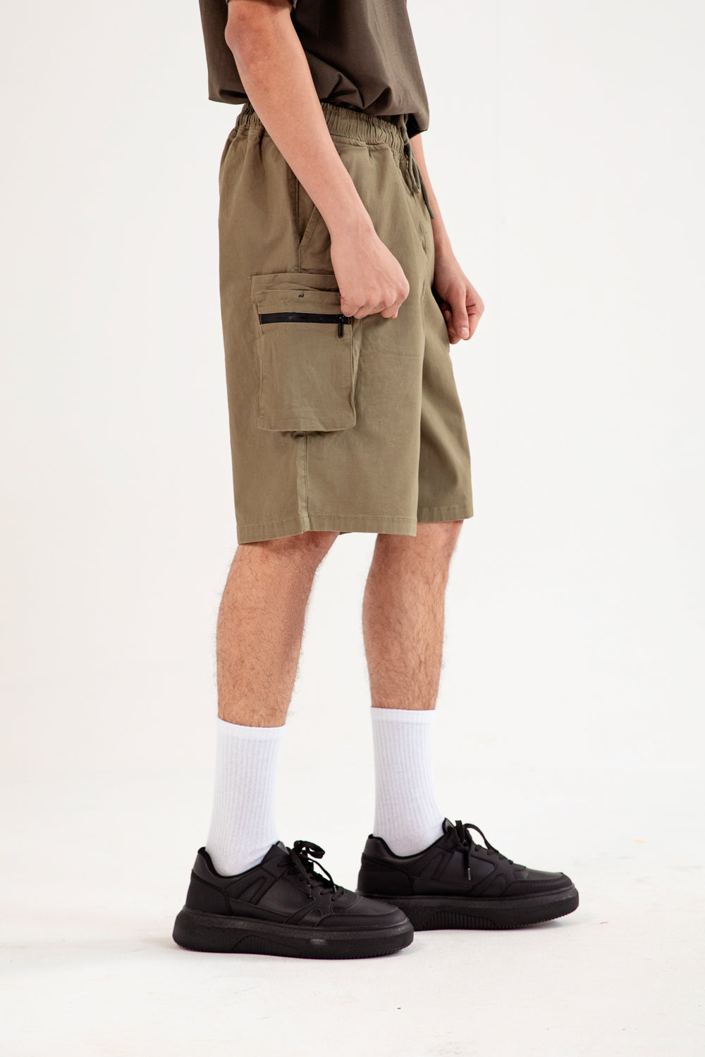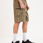 Baggy fit cargo shorts in olive with a cotton blend finish and roomy cargo pockets with zippers.