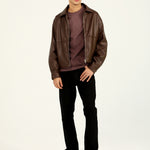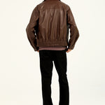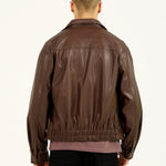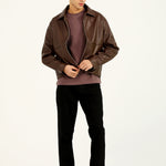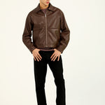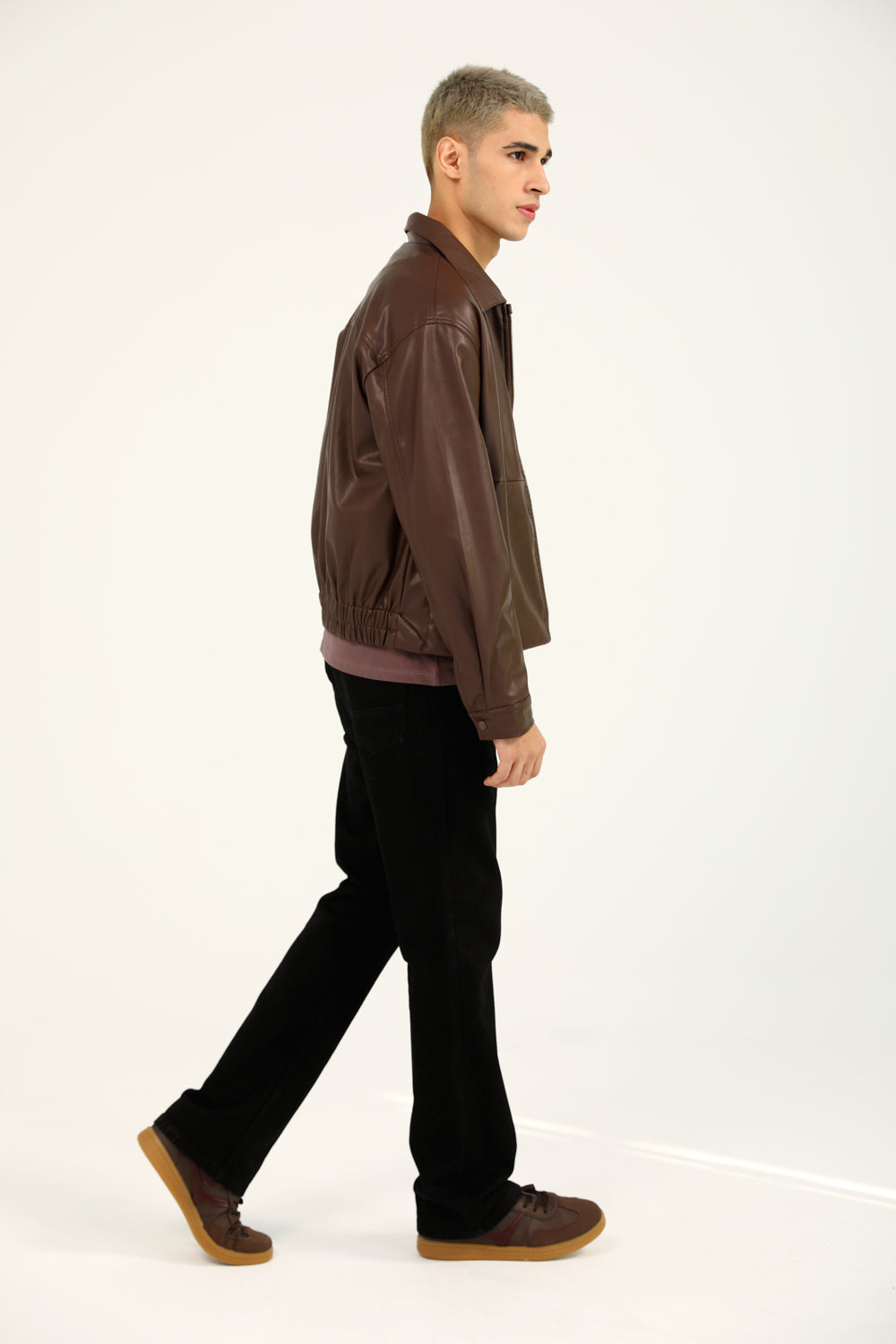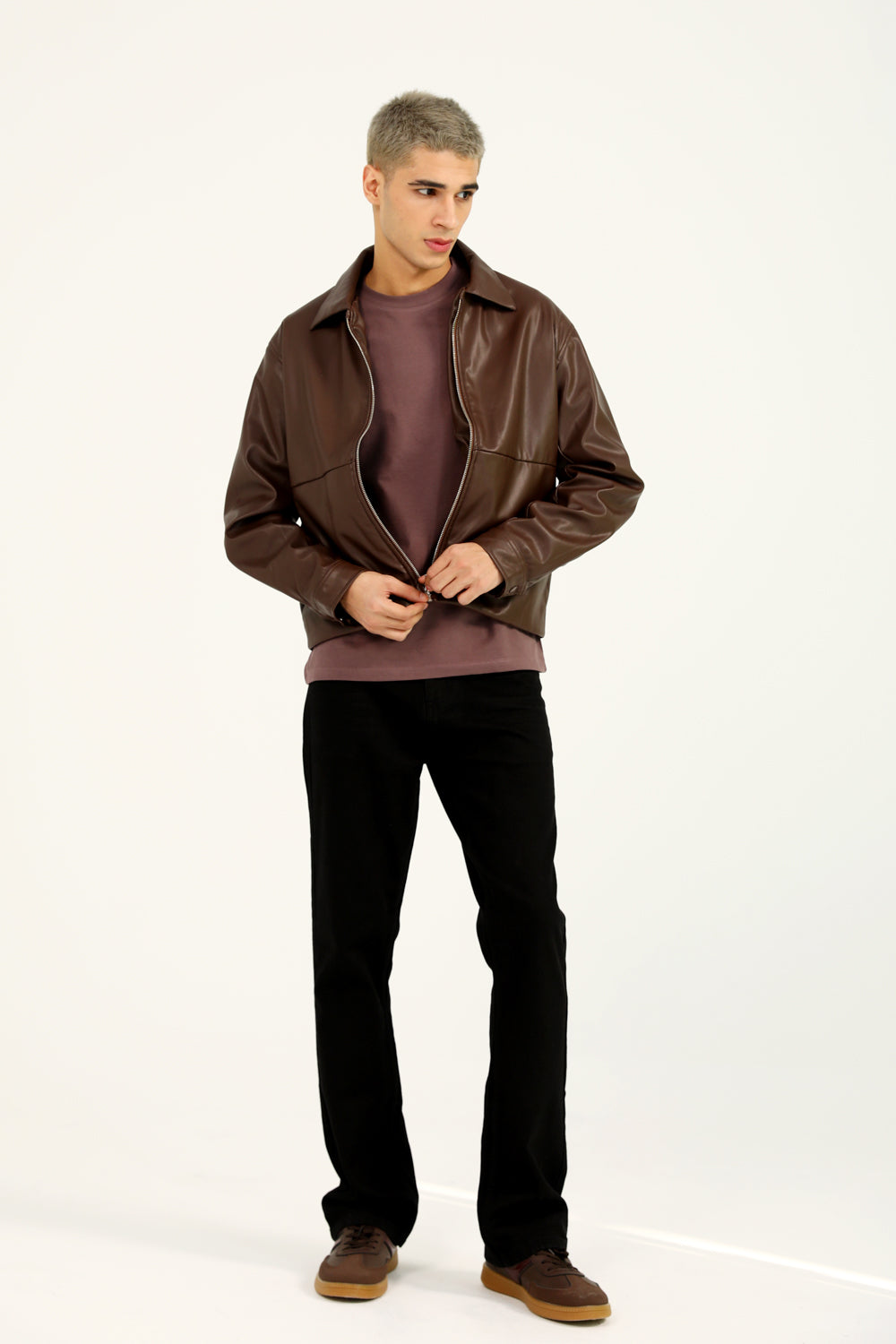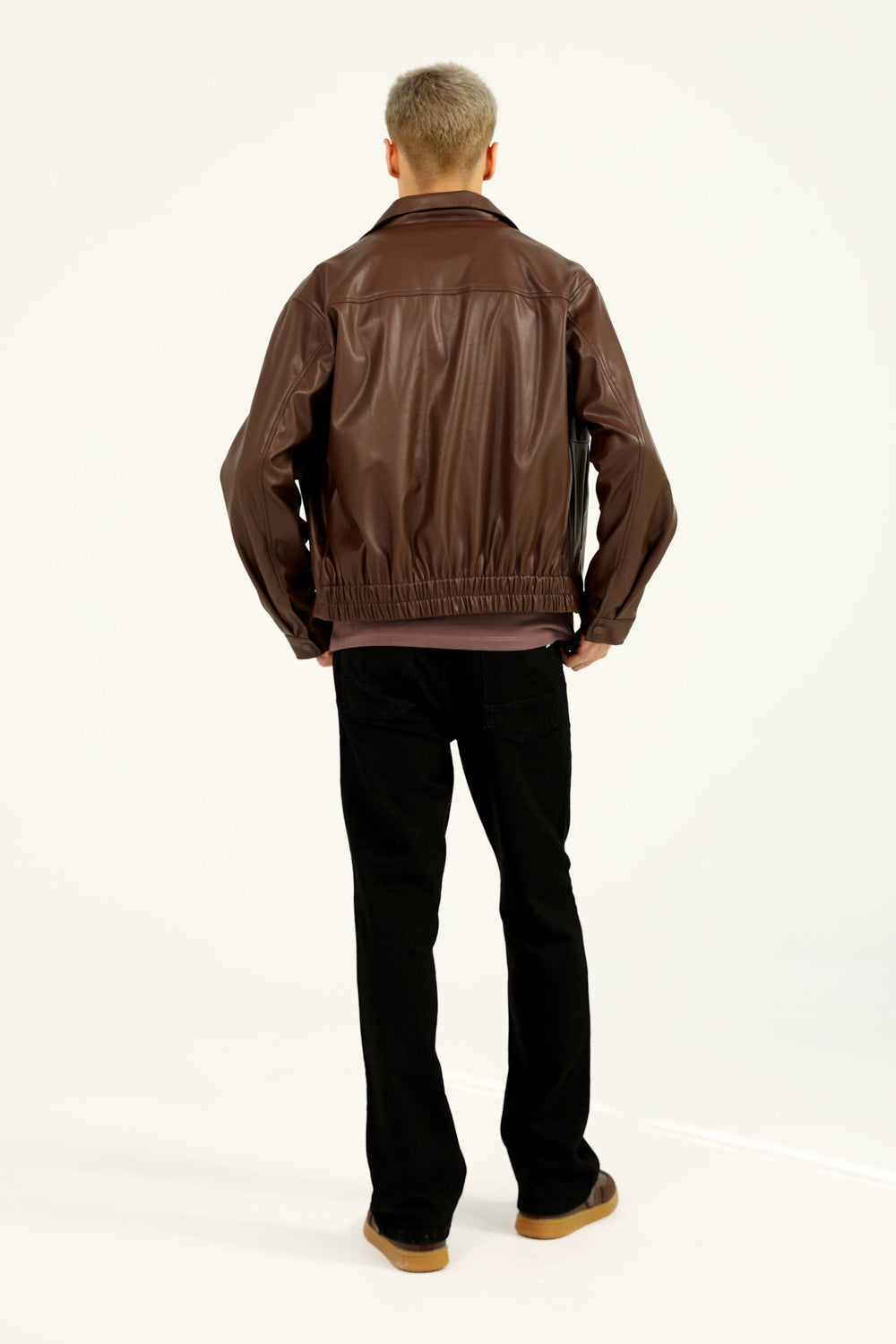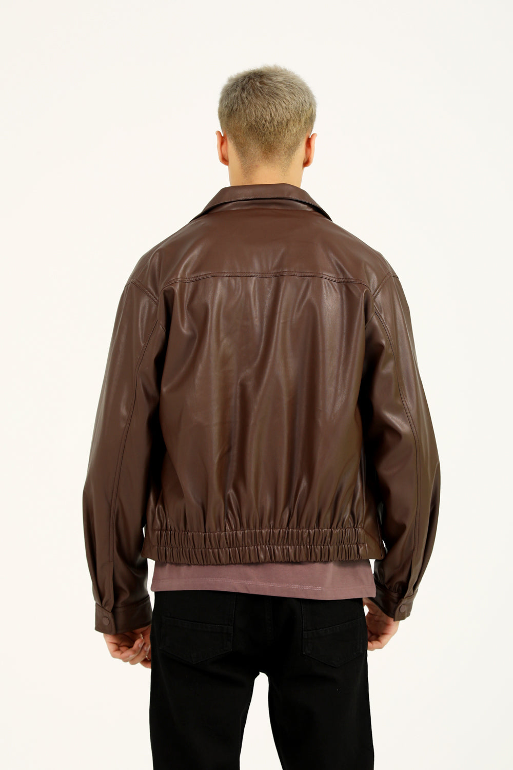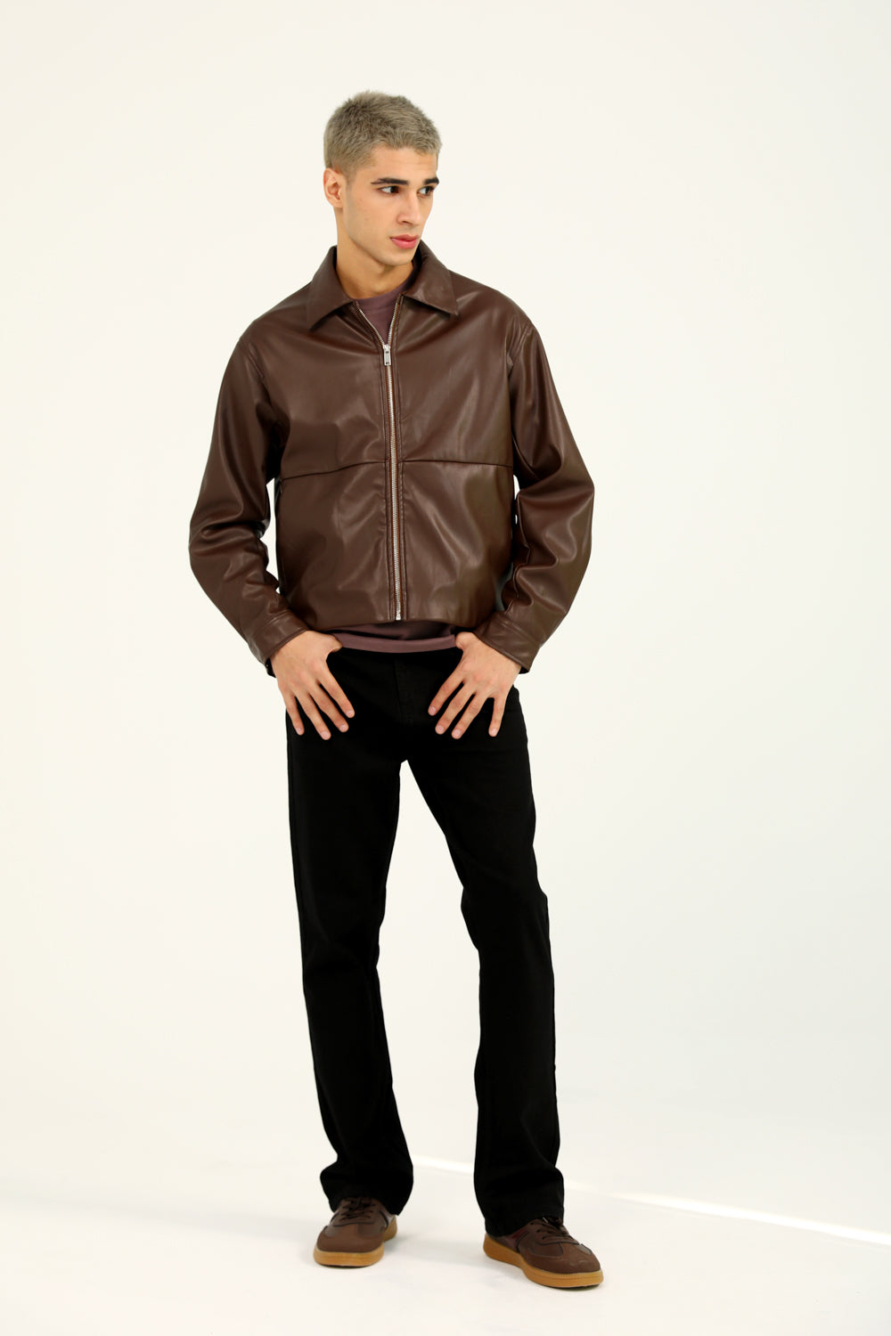 Brown faux leather jacket featuring a zipper closure and a clean, minimal cut.