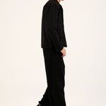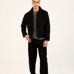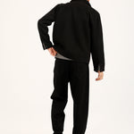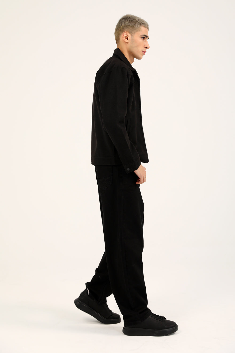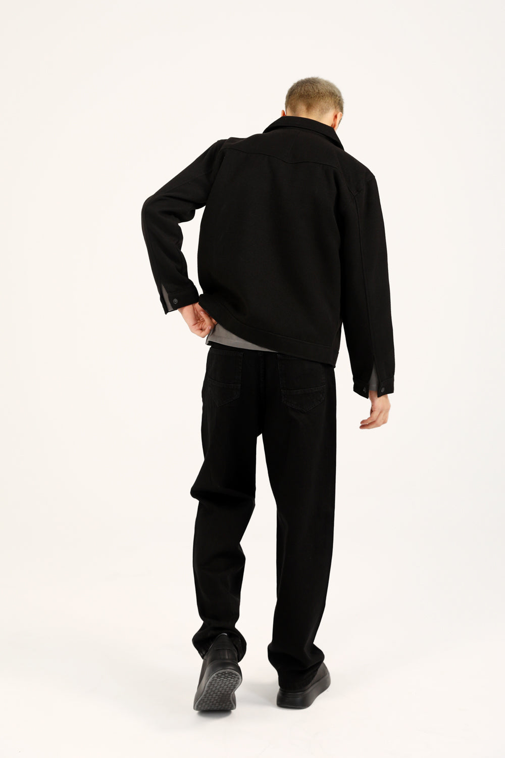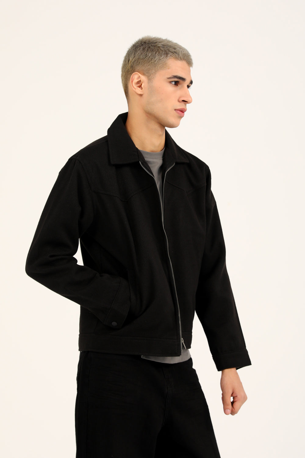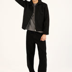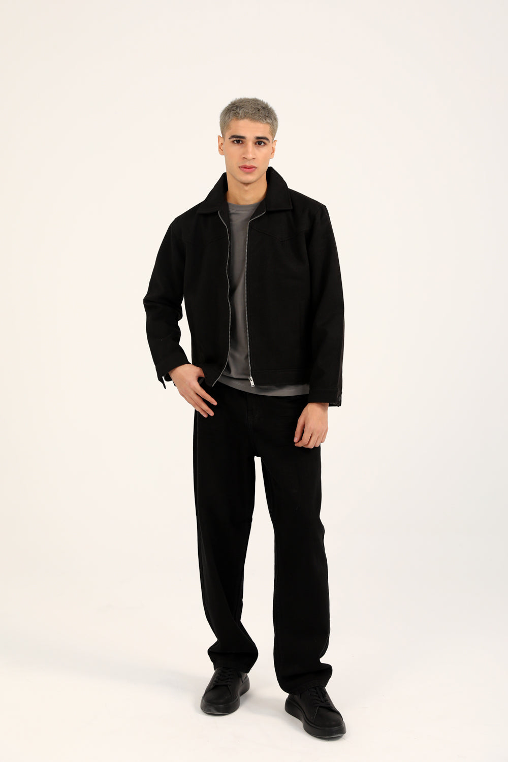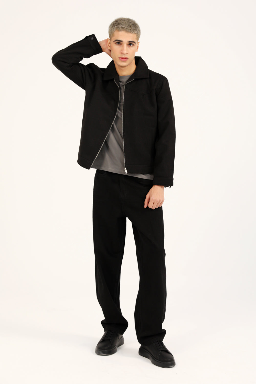 Black wool blend jacket featuring a zipper closure and a clean, minimal cut.