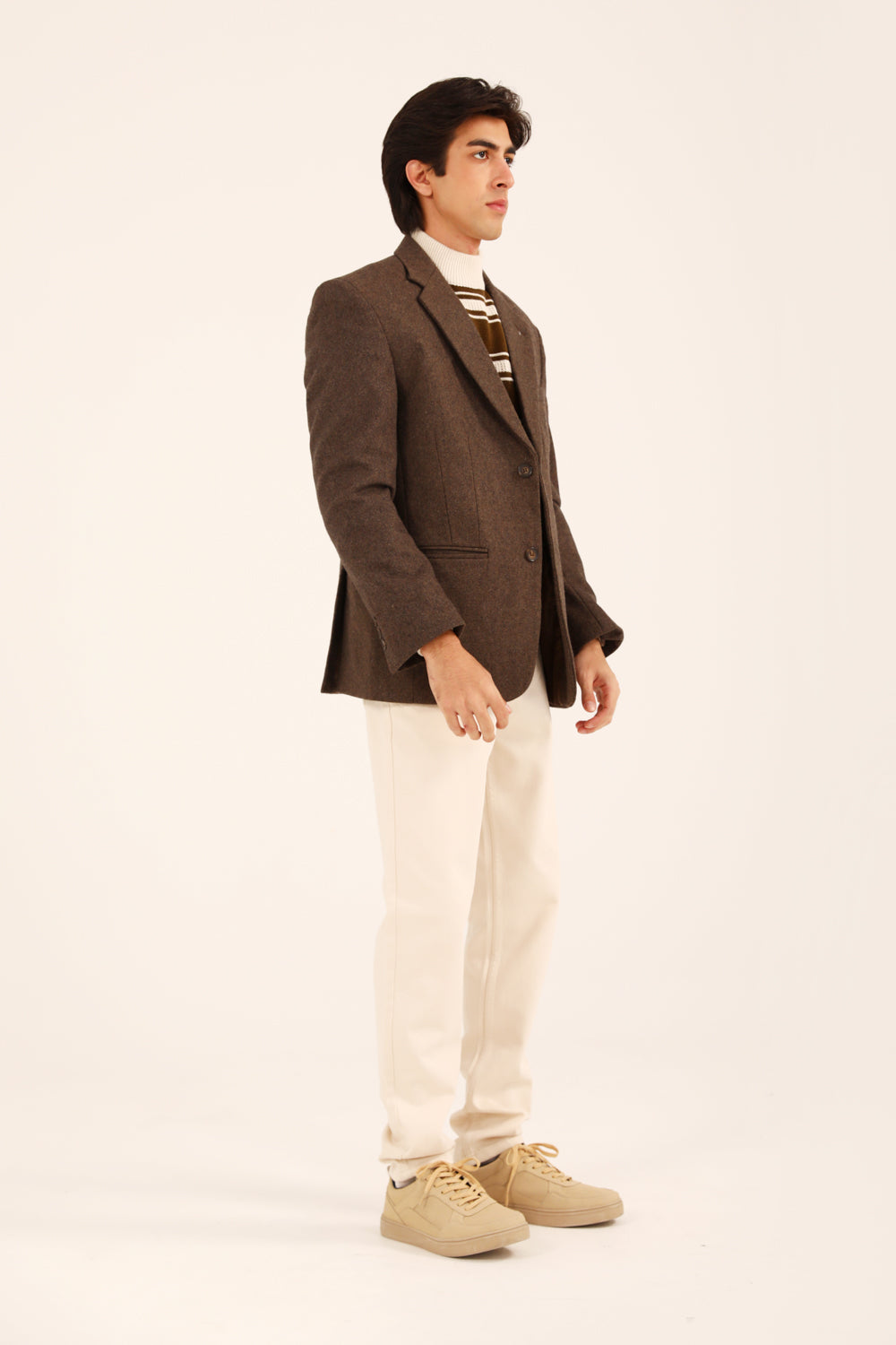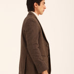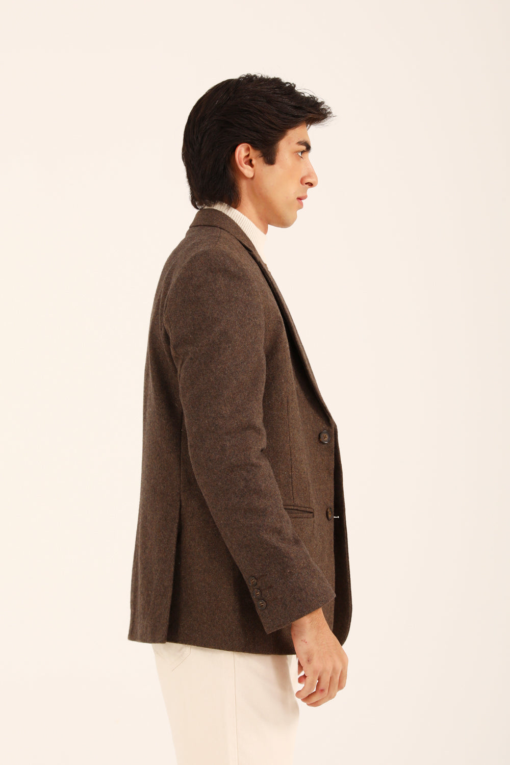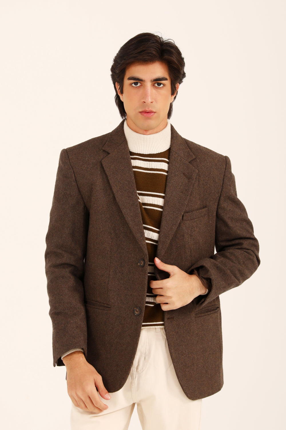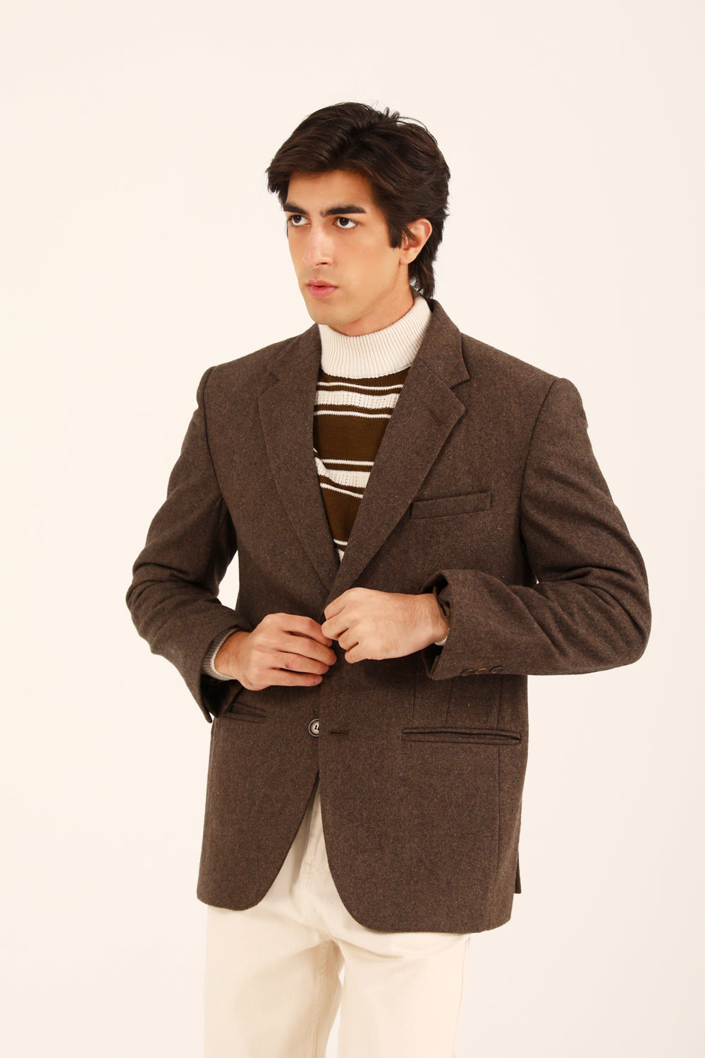 Brown textured wool blend coat with matching buttons and welt pockets.